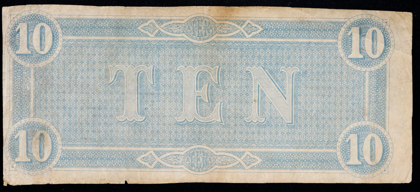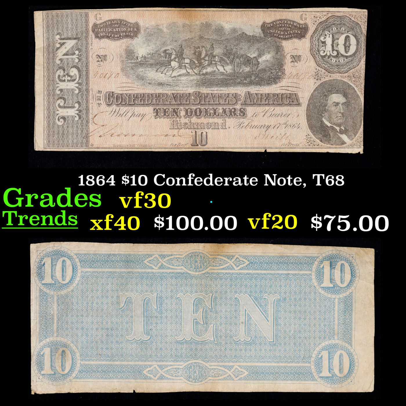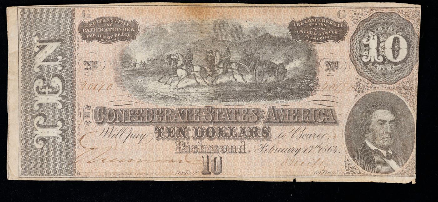 1864 $10 Confederate Note, T68 Grades vf++. Of great historical interest this is the last $10 currency notes issued by the Confederate States of America. The 7th and last issue of Confederate notes. Notes hand signed and numbered by Confederate soldiers and families. Printed and issued over 140 years ago during the Civil War. Depicts Confederate cabinet member Robert M. T. Hunter and features a detailed vignette of horse-drawn artillery. This large 7" x 3" Confederate $10 note is a genuine keepsake from one of the most significant periods in American history.