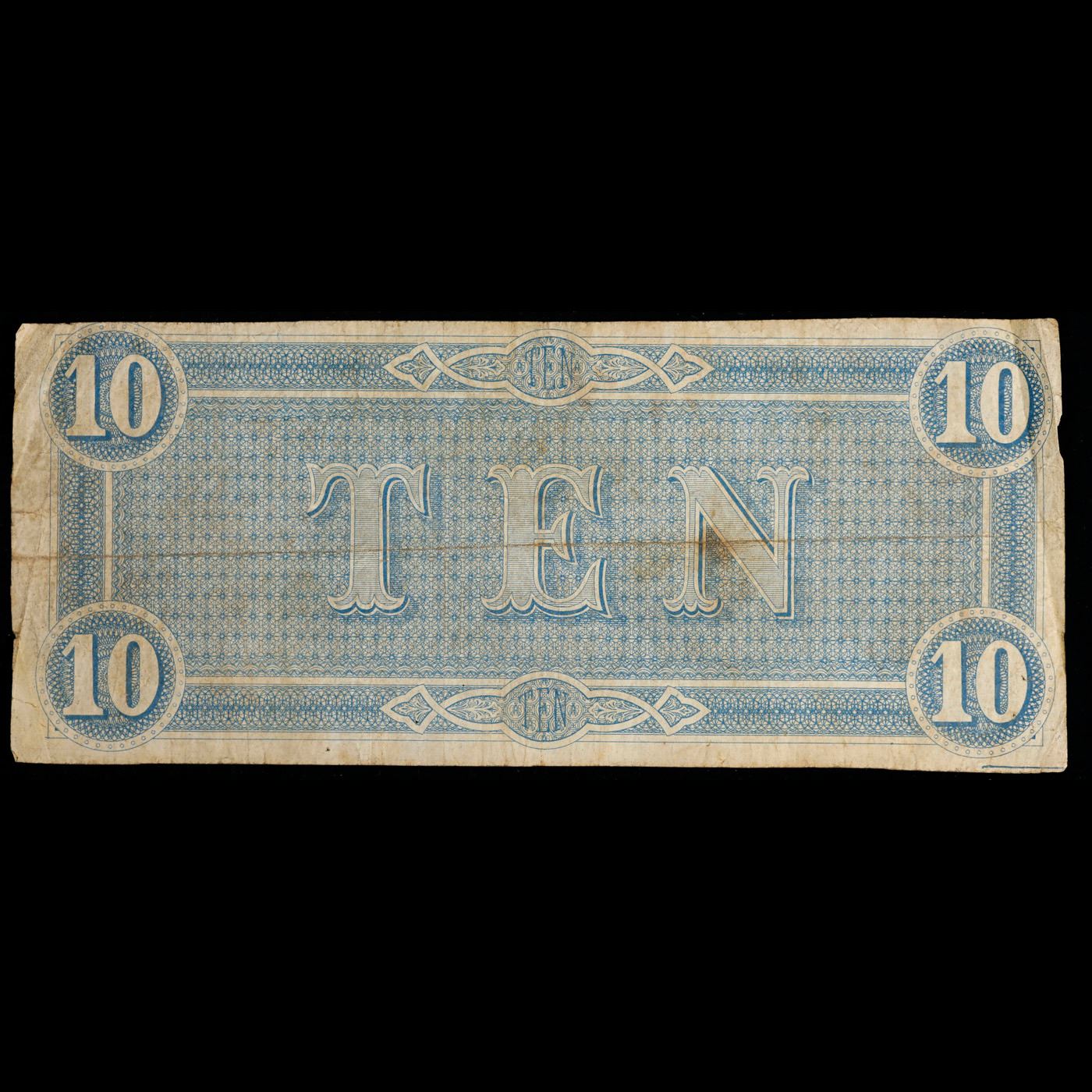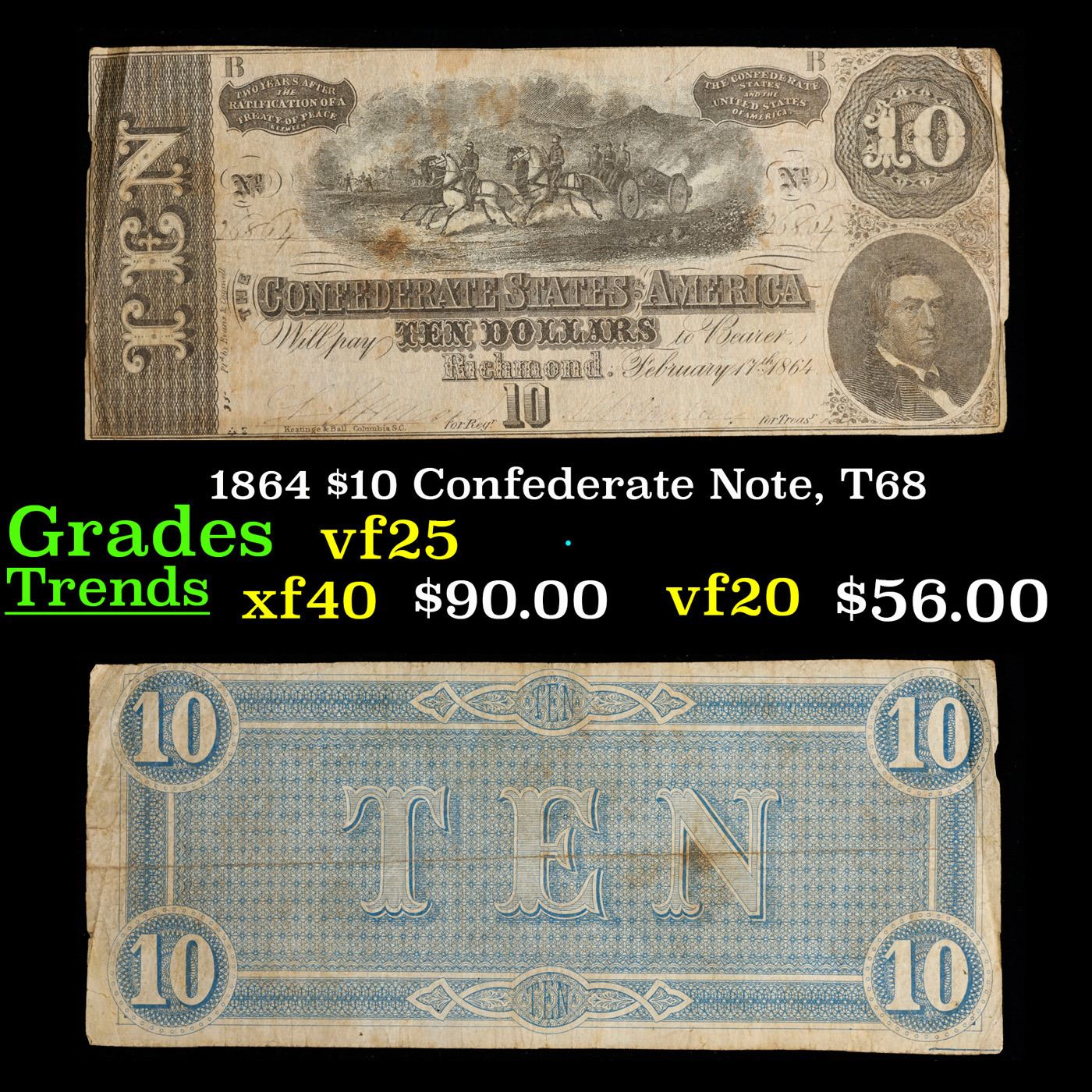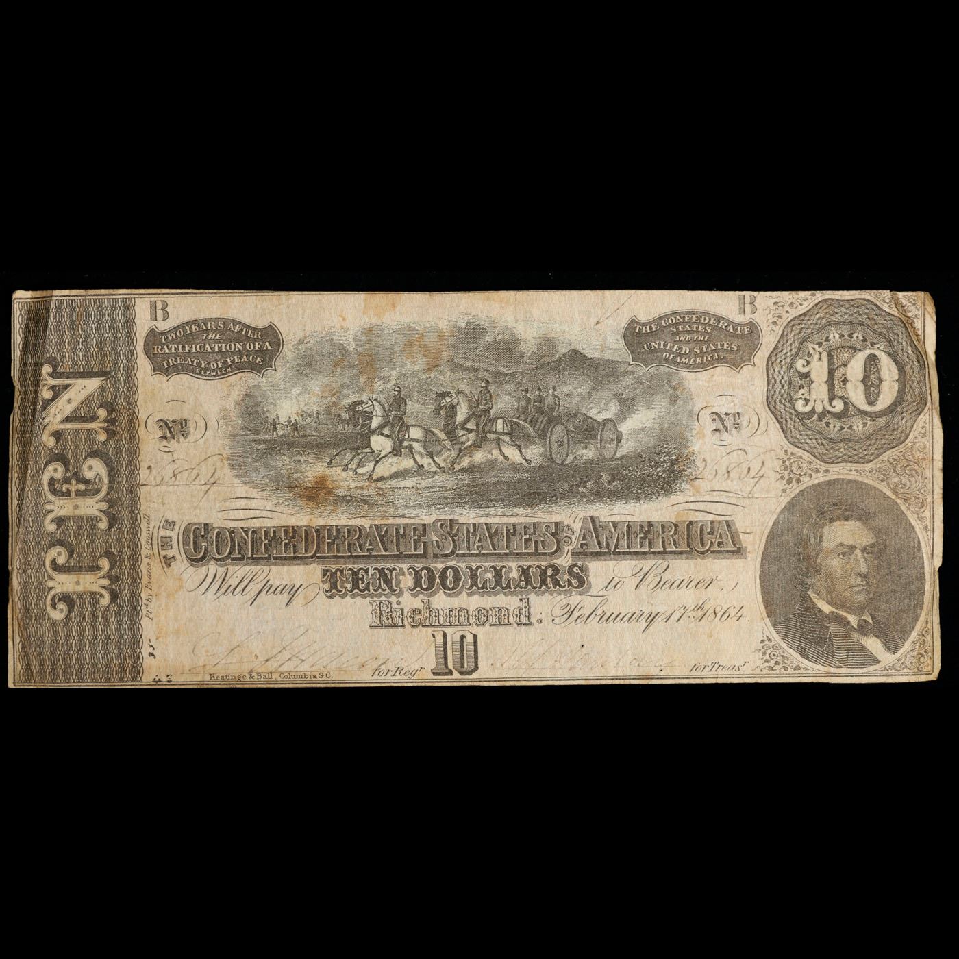 1864 $10 Confederate Note, T68 Grades vf+. Of great historical interest this is the last $10 currency notes issued by the Confederate States of America. The 7th and last issue of Confederate notes. Notes hand signed and numbered by Confederate soldiers and families. Printed and issued over 140 years ago during the Civil War. Depicts Confederate cabinet member Robert M. T. Hunter and features a detailed vignette of horse-drawn artillery. This large 7" x 3" Confederate $10 note is a genuine keepsake from one of the most significant periods in American history.