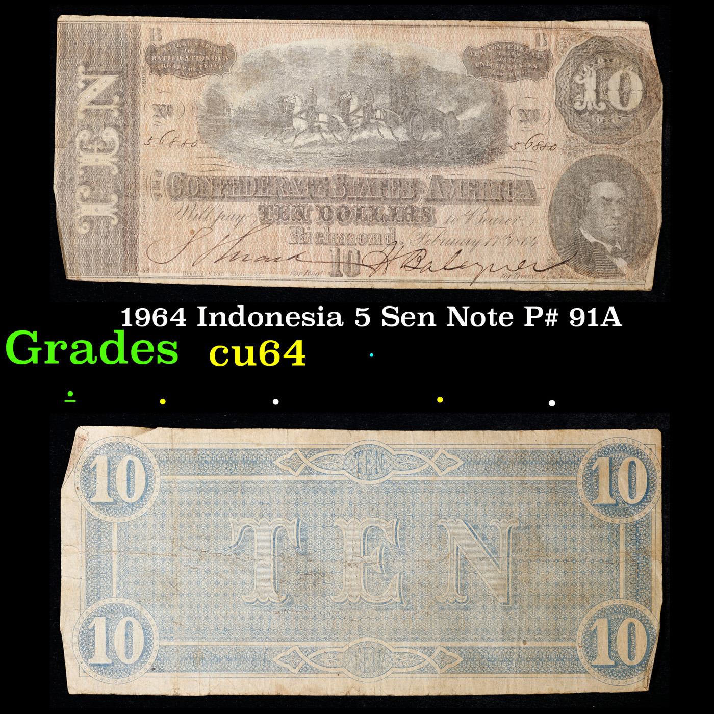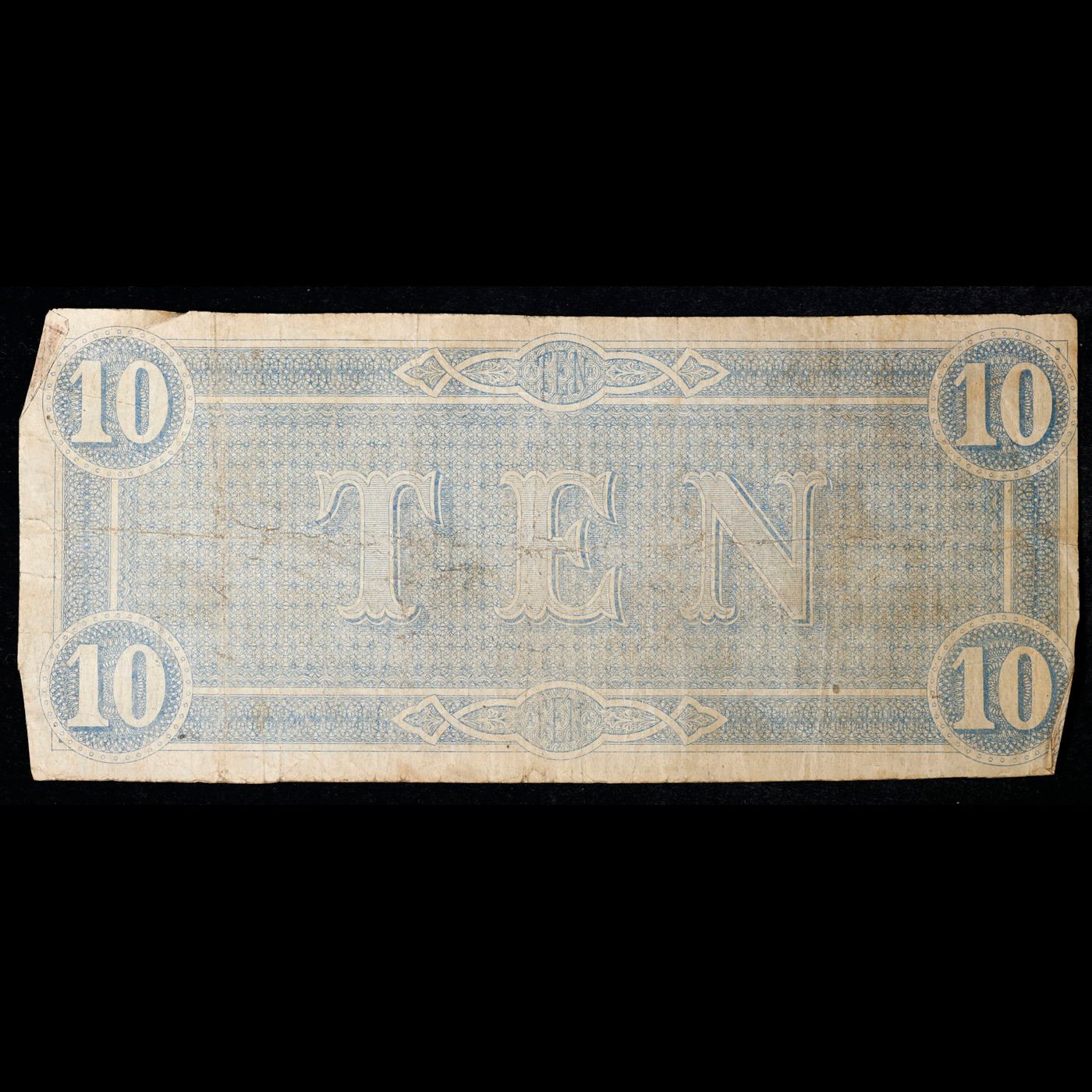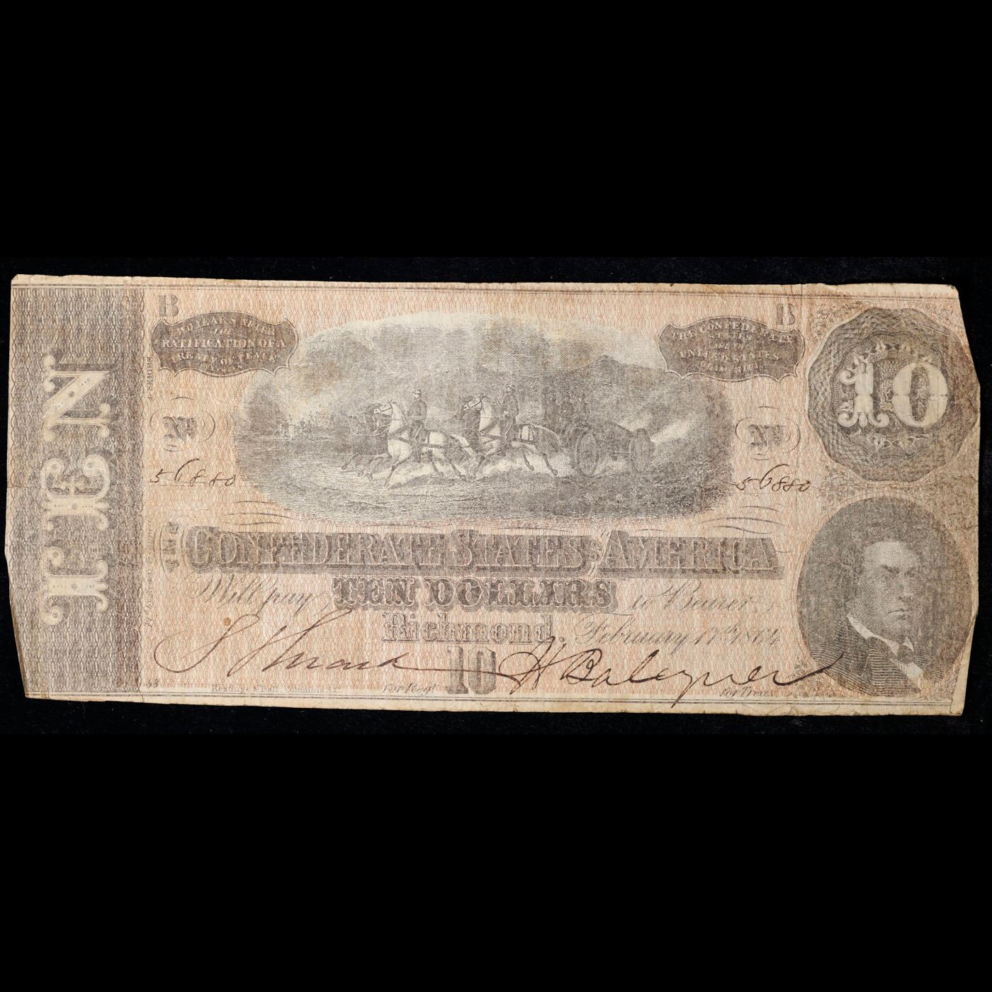 1864 $10 Confederate Note, T68 Grades vf+. Of great historical interest this is the last $10 currency notes issued by the Confederate States of America. The 7th and last issue of Confederate notes. Notes hand signed and numbered by Confederate soldiers and families. Printed and issued over 140 years ago during the Civil War. Depicts Confederate cabinet member Robert M. T. Hunter and features a detailed vignette of horse-drawn artillery. This large 7" x 3" Confederate $10 note is a genuine keepsake from one of the most significant periods in American history.