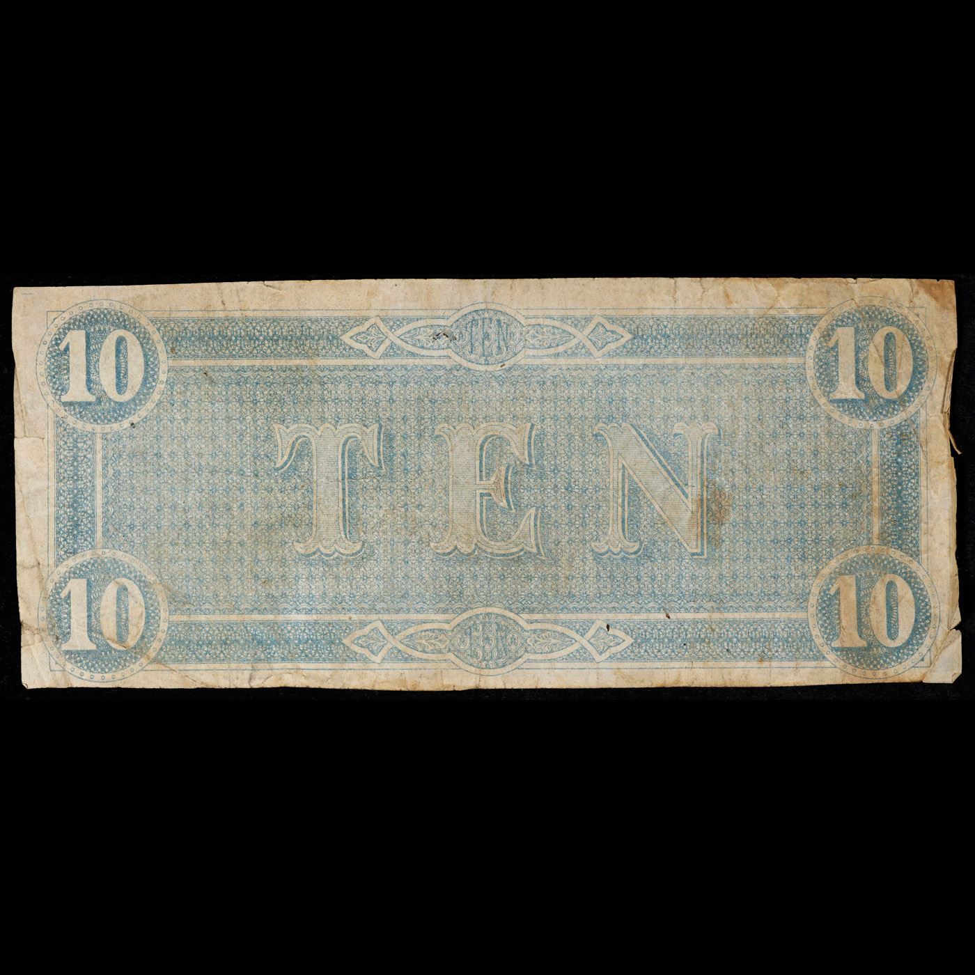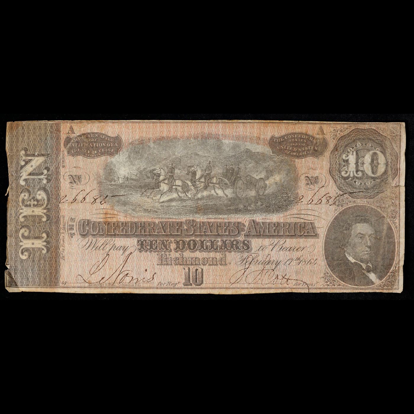 1864 $10 Confederate Note, T68 Grades vf+. Of great historical interest this is the last $10 currency notes issued by the Confederate States of America. The 7th and last issue of Confederate notes. Notes hand signed and numbered by Confederate soldiers and families. Printed and issued over 140 years ago during the Civil War. Depicts Confederate cabinet member Robert M. T. Hunter and features a detailed vignette of horse-drawn artillery. This large 7" x 3" Confederate $10 note is a genuine keepsake from one of the most significant periods in American history.