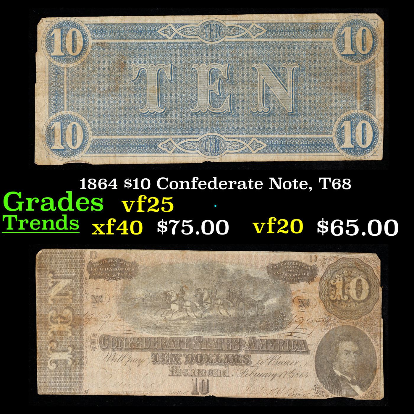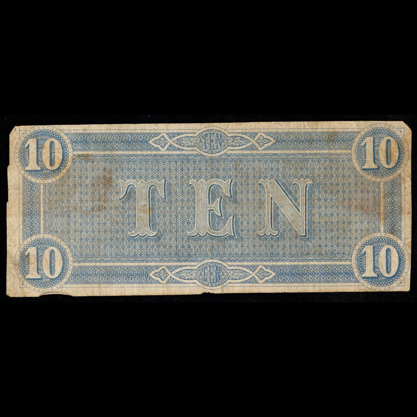 1864 $10 Confederate Note, T68 Grades vf+