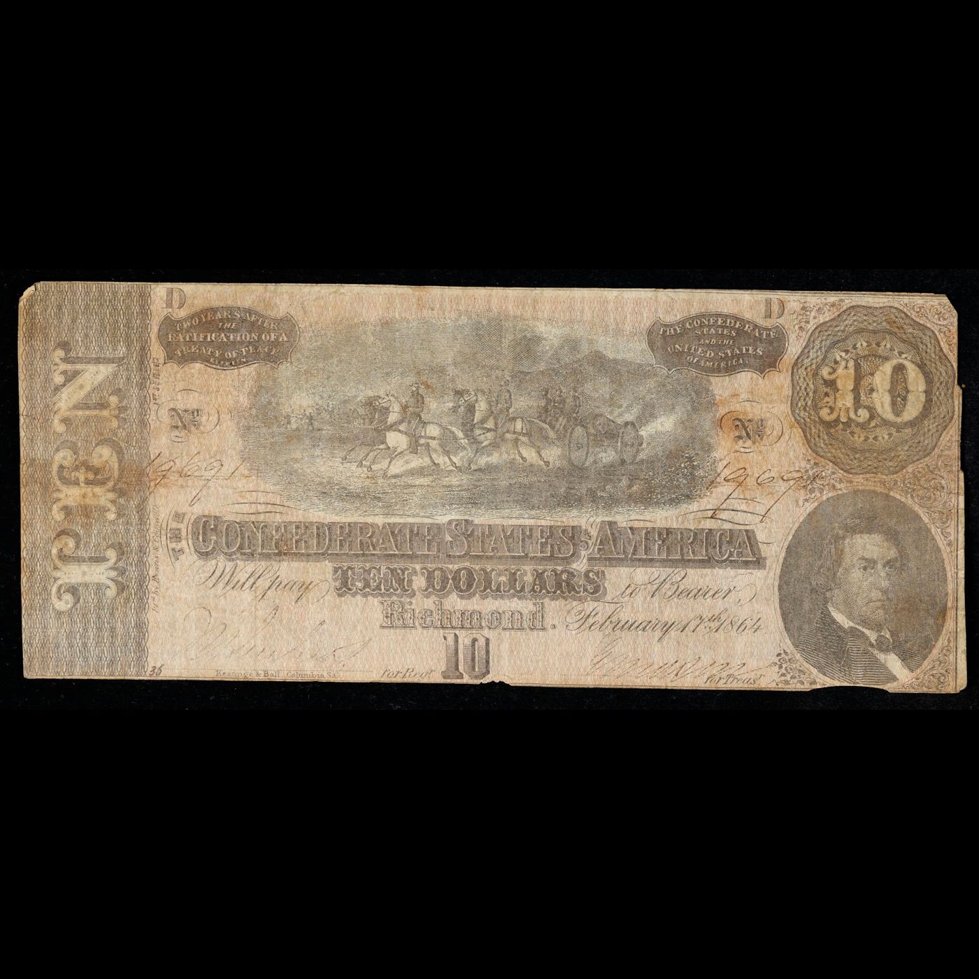1864 $10 Confederate Note, T68 Grades vf+. Of great historical interest this is the last $10 currency notes issued by the Confederate States of America. The 7th and last issue of Confederate notes. Notes hand signed and numbered by Confederate soldiers and families. Printed and issued over 140 years ago during the Civil War. Depicts Confederate cabinet member Robert M. T. Hunter and features a detailed vignette of horse-drawn artillery. This large 7" x 3" Confederate $10 note is a genuine keepsake from one of the most significant periods in American history.