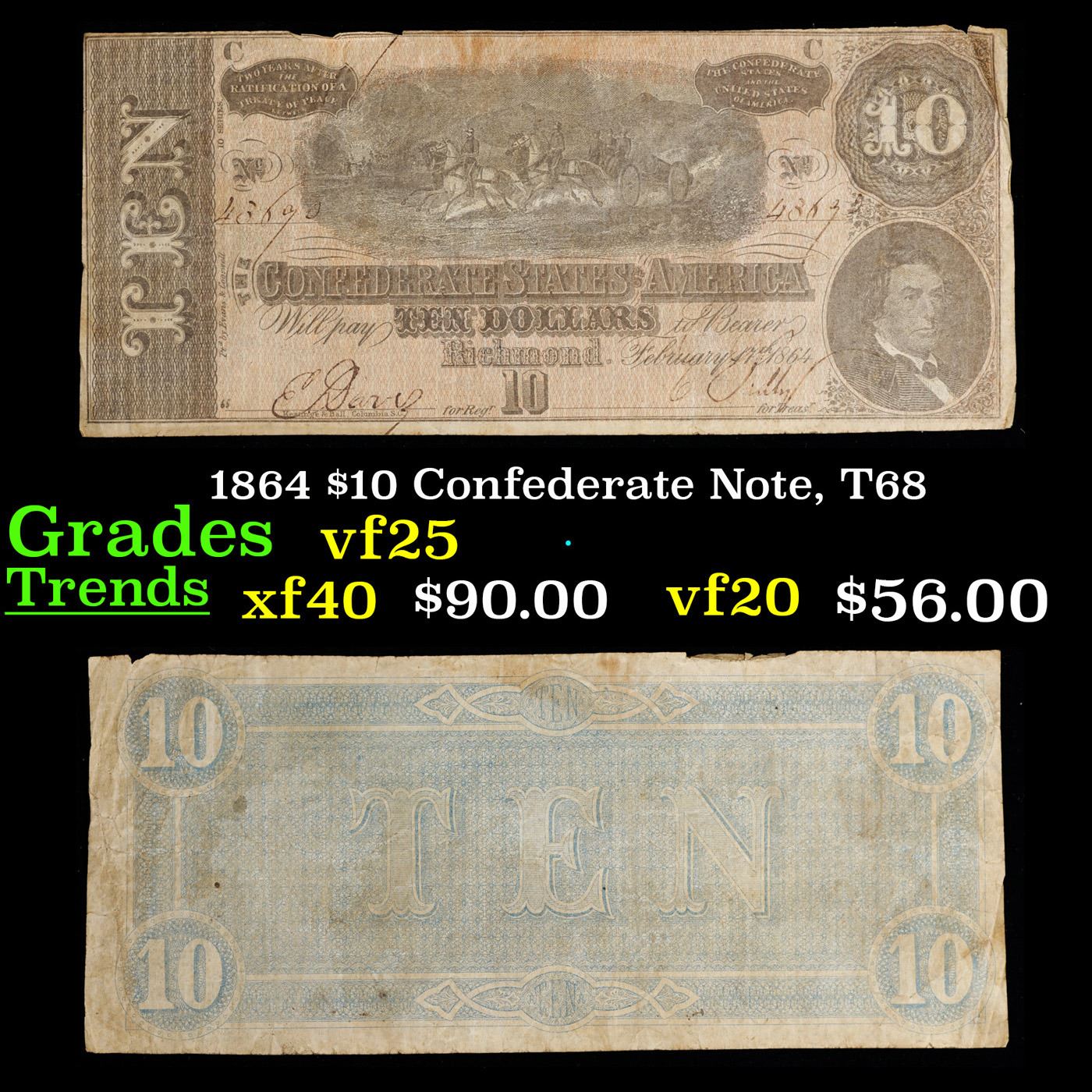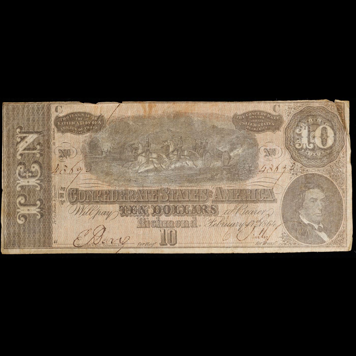 1864 $10 Confederate Note, T68 Grades vf+. Of great historical interest this is the last $10 currency notes issued by the Confederate States of America. The 7th and last issue of Confederate notes. Notes hand signed and numbered by Confederate soldiers and families. Printed and issued over 140 years ago during the Civil War. Depicts Confederate cabinet member Robert M. T. Hunter and features a detailed vignette of horse-drawn artillery. This large 7" x 3" Confederate $10 note is a genuine keepsake from one of the most significant periods in American history.