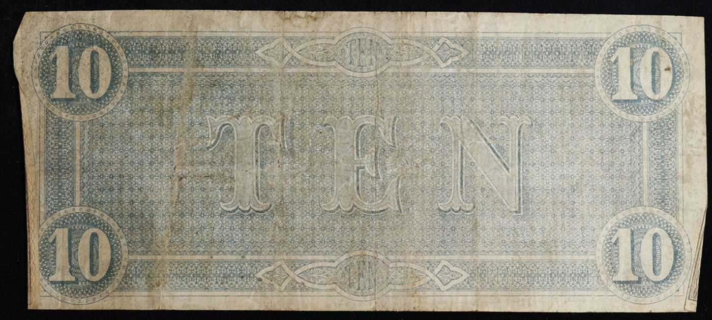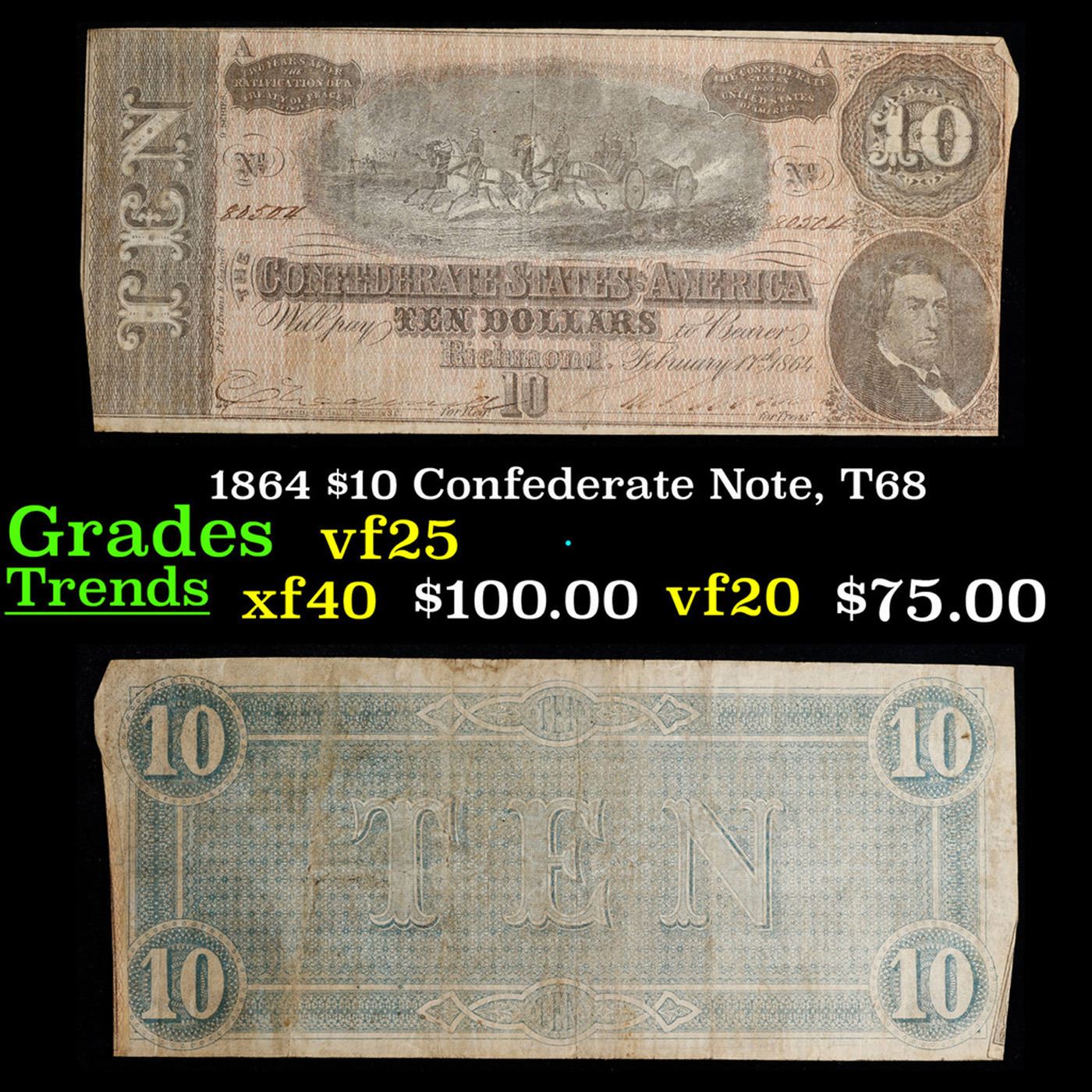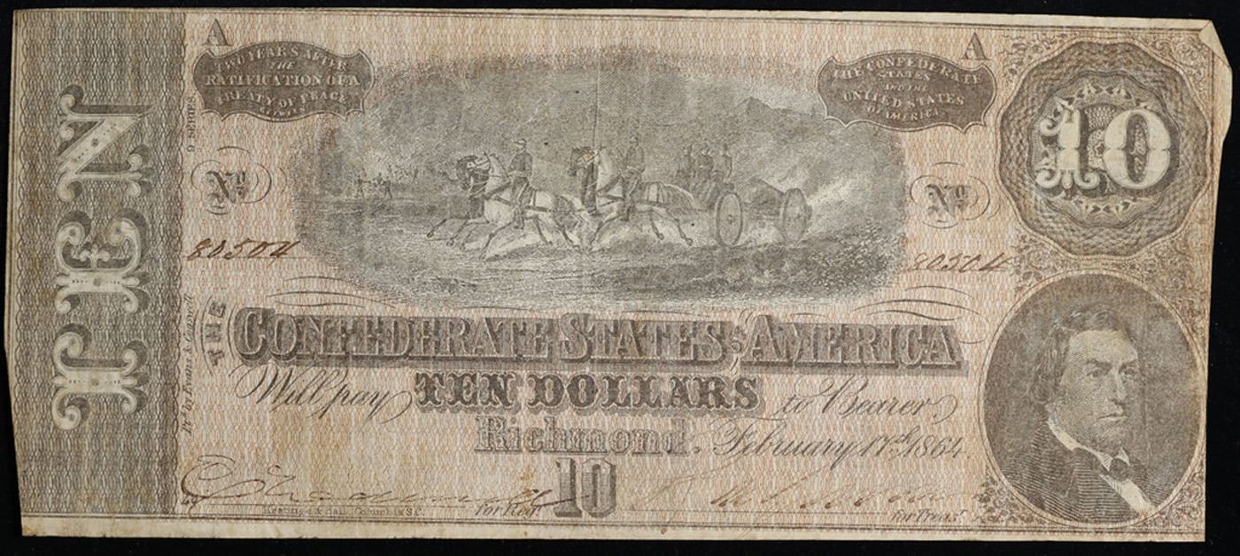 1864 $10 Confederate Note, T68 Grades vf+. Of great historical interest this is the last $10 currency notes issued by the Confederate States of America. The 7th and last issue of Confederate notes. Notes hand signed and numbered by Confederate soldiers and families. Printed and issued over 140 years ago during the Civil War. Depicts Confederate cabinet member Robert M. T. Hunter and features a detailed vignette of horse-drawn artillery. This large 7" x 3" Confederate $10 note is a genuine keepsake from one of the most significant periods in American history.