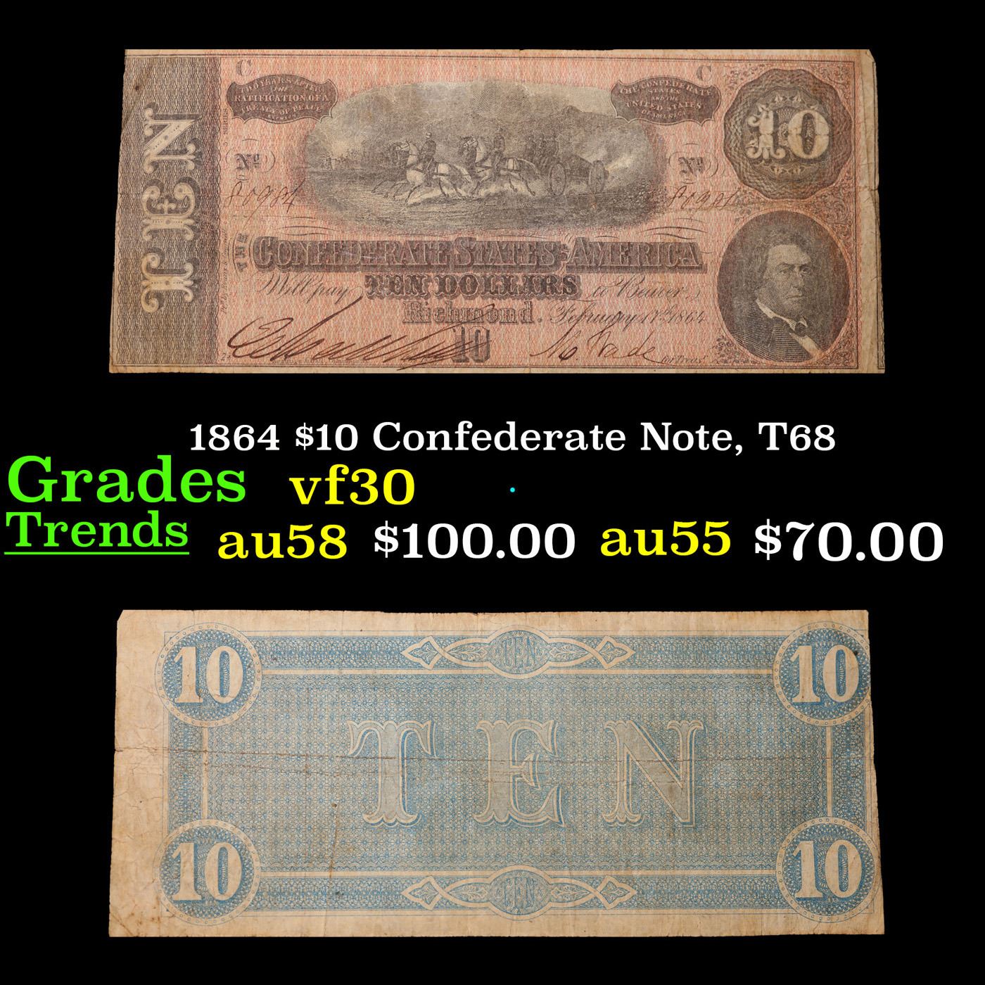 1864 $10 Confederate Note, T68 Grades vf++. Of great historical interest this is the last $10 currency notes issued by the Confederate States of America. The 7th and last issue of Confederate notes. Notes hand signed and numbered by Confederate soldiers and families. Printed and issued over 140 years ago during the Civil War. Depicts Confederate cabinet member Robert M. T. Hunter and features a detailed vignette of horse-drawn artillery. This large 7" x 3" Confederate $10 note is a genuine keepsake from one of the most significant periods in American history.