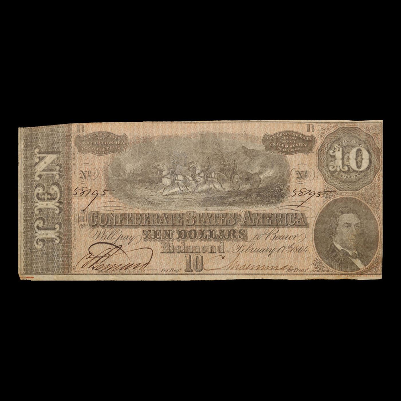 1864 $10 Confederate Note, T68 Grades vf++. Of great historical interest this is the last $10 currency notes issued by the Confederate States of America. The 7th and last issue of Confederate notes. Notes hand signed and numbered by Confederate soldiers and families. Printed and issued over 140 years ago during the Civil War. Depicts Confederate cabinet member Robert M. T. Hunter and features a detailed vignette of horse-drawn artillery. This large 7" x 3" Confederate $10 note is a genuine keepsake from one of the most significant periods in American history.