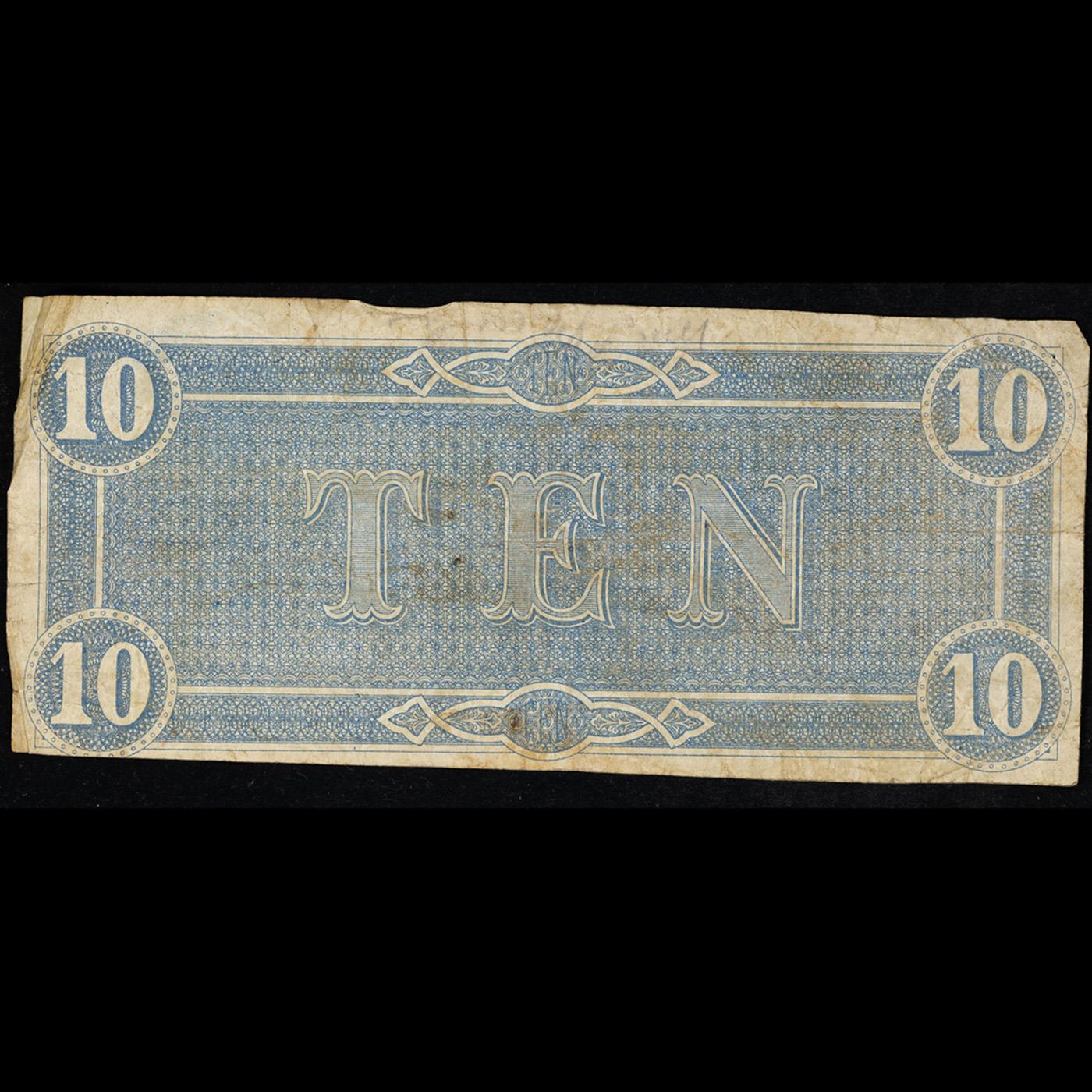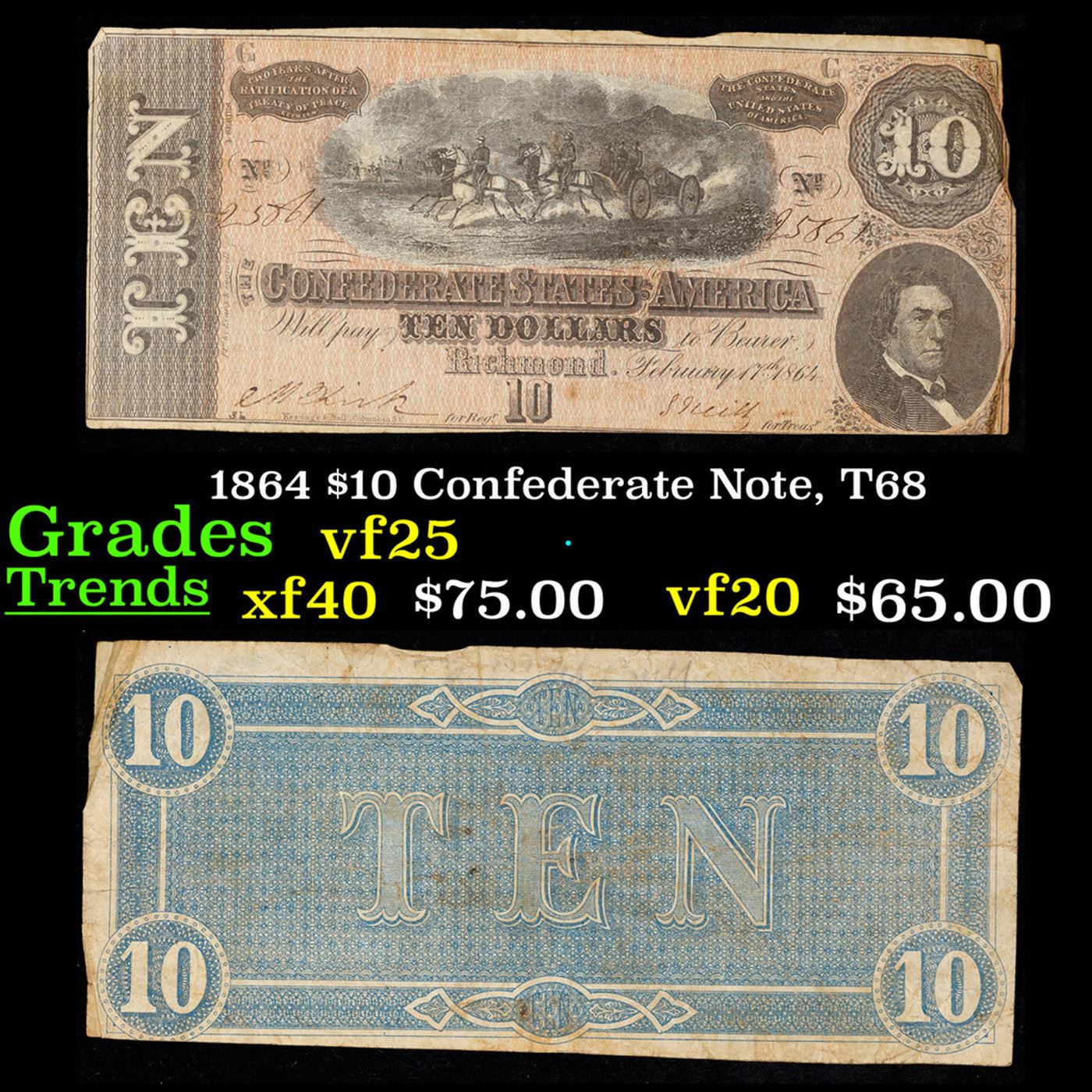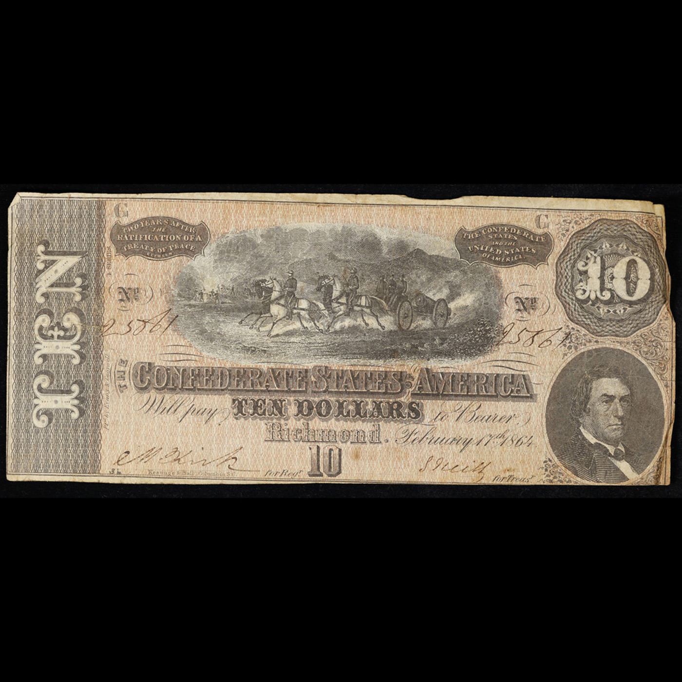 1864 $10 Confederate Note, T68 Grades vf+. Of great historical interest this is the last $10 currency notes issued by the Confederate States of America. The 7th and last issue of Confederate notes. Notes hand signed and numbered by Confederate soldiers and families. Printed and issued over 140 years ago during the Civil War. Depicts Confederate cabinet member Robert M. T. Hunter and features a detailed vignette of horse-drawn artillery. This large 7" x 3" Confederate $10 note is a genuine keepsake from one of the most significant periods in American history.