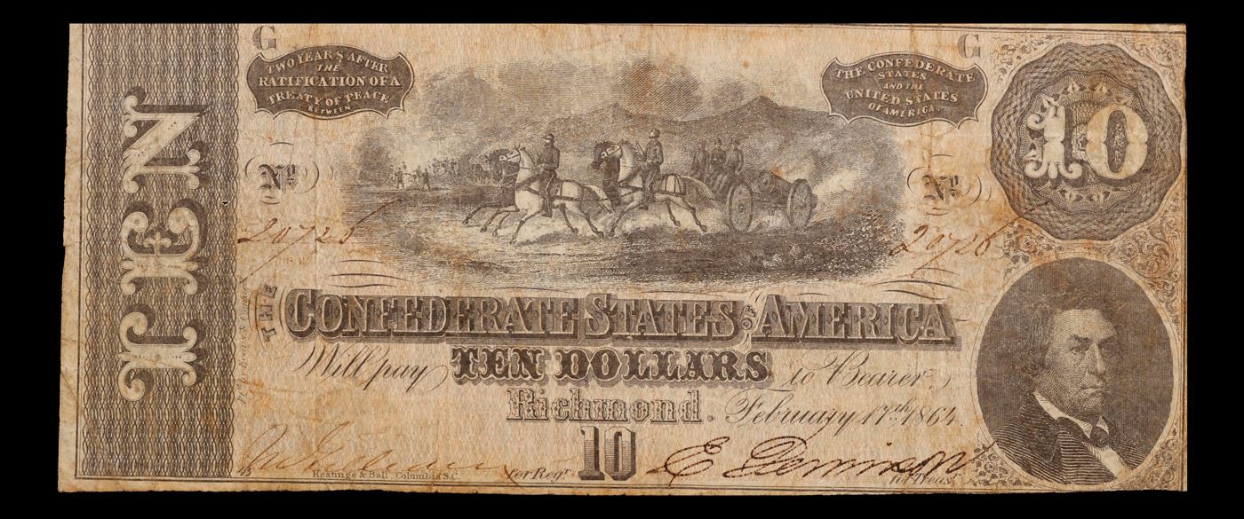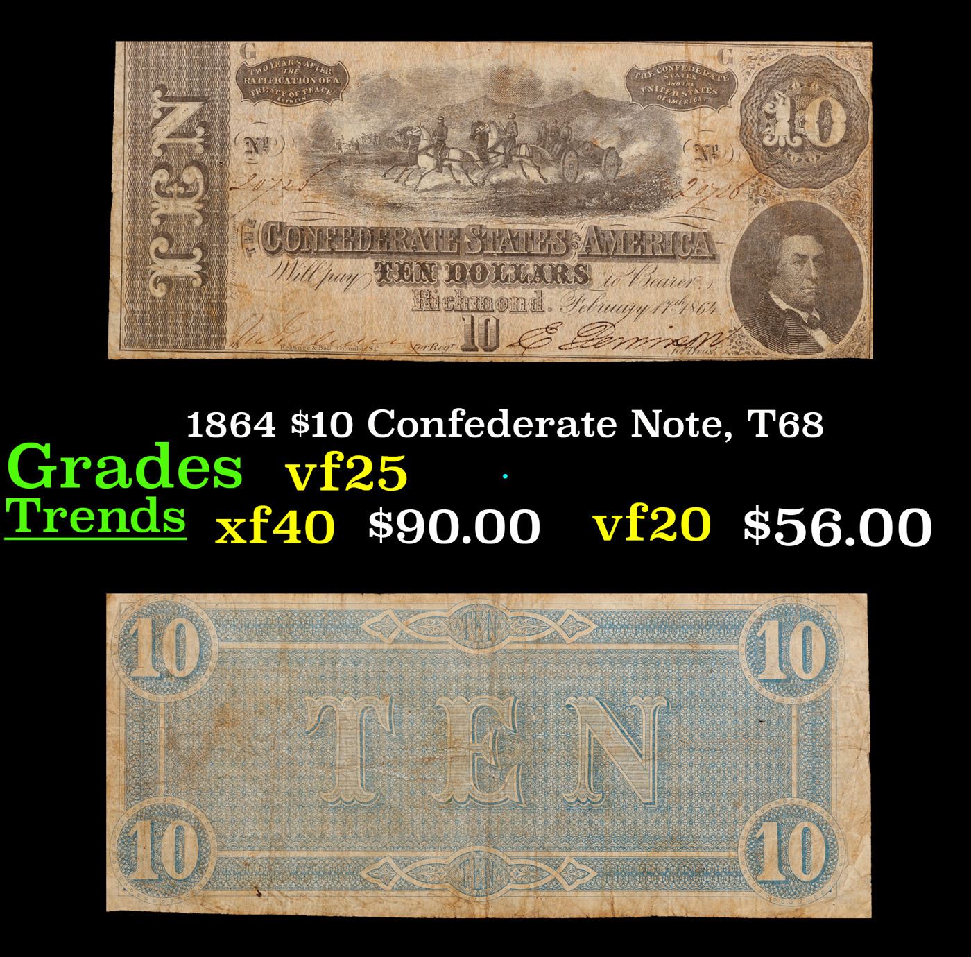 1864 $10 Confederate Note, T68 Grades vf++. Of great historical interest this is the last $10 currency notes issued by the Confederate States of America. The 7th and last issue of Confederate notes. Notes hand signed and numbered by Confederate soldiers and families. Printed and issued over 140 years ago during the Civil War. Depicts Confederate cabinet member Robert M. T. Hunter and features a detailed vignette of horse-drawn artillery. This large 7" x 3" Confederate $10 note is a genuine keepsake from one of the most significant periods in American history.
