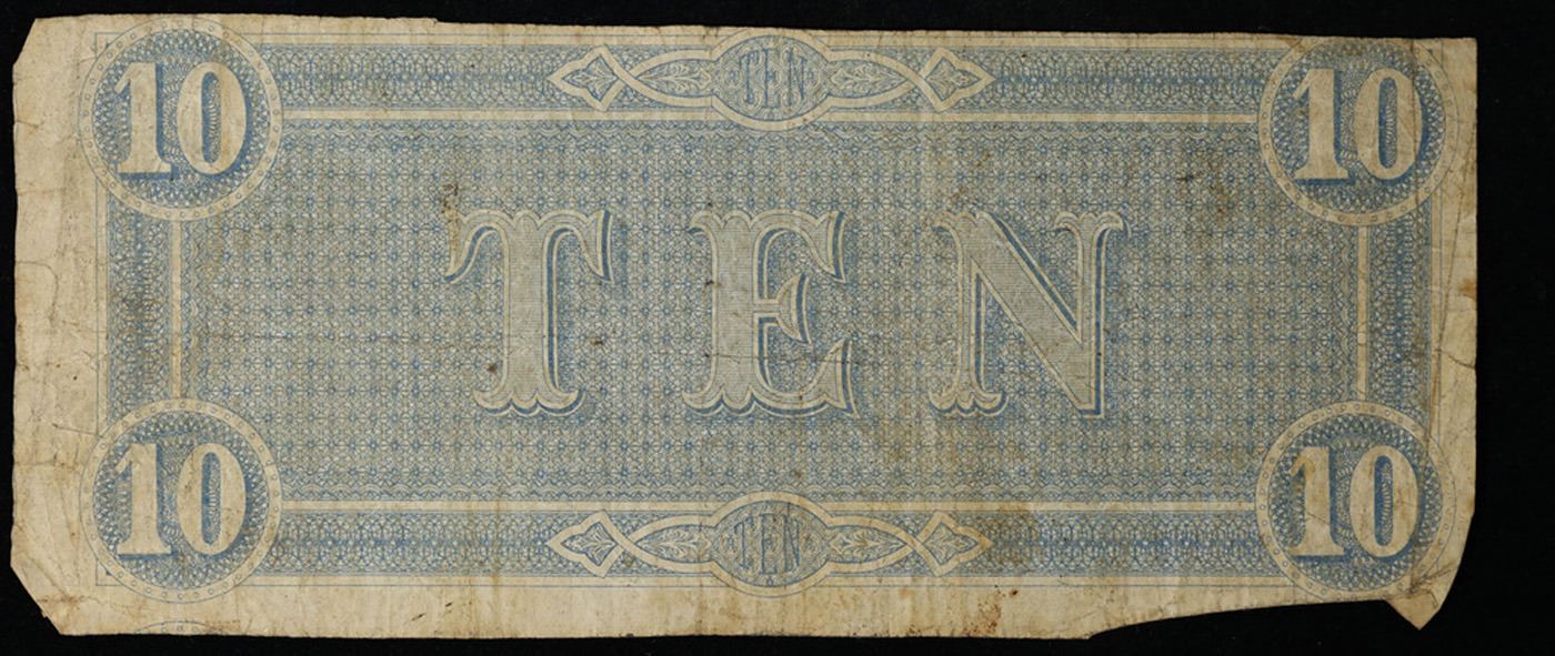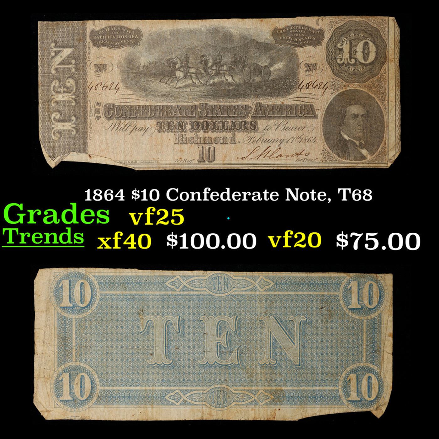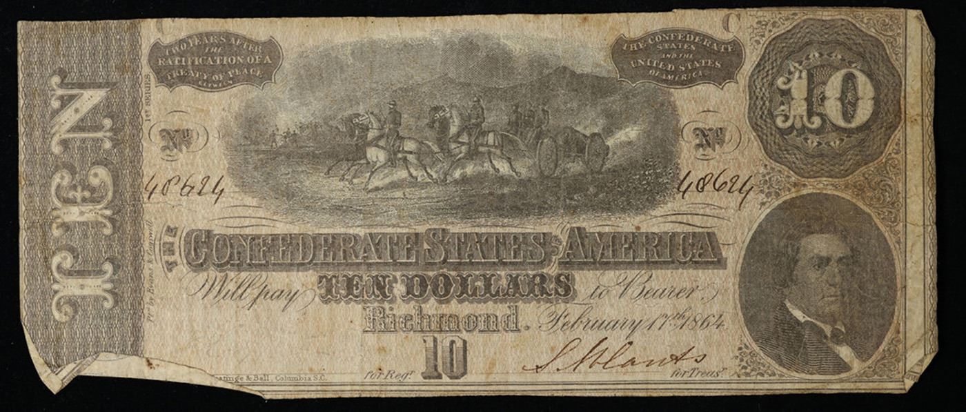 1864 $10 Confederate Note, T68 Grades vf+. Of great historical interest this is the last $10 currency notes issued by the Confederate States of America. The 7th and last issue of Confederate notes. Notes hand signed and numbered by Confederate soldiers and families. Printed and issued over 140 years ago during the Civil War. Depicts Confederate cabinet member Robert M. T. Hunter and features a detailed vignette of horse-drawn artillery. This large 7" x 3" Confederate $10 note is a genuine keepsake from one of the most significant periods in American history.