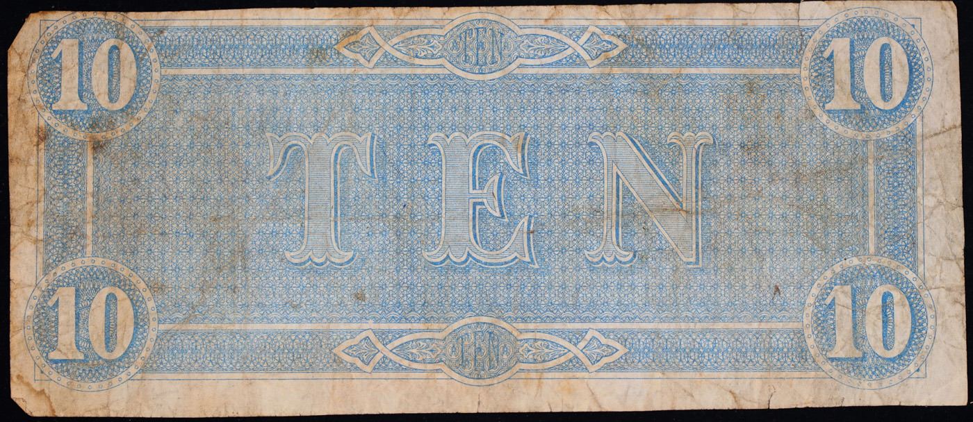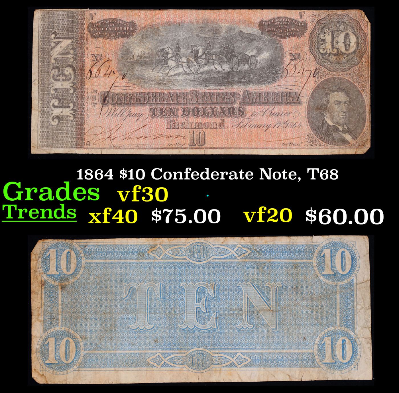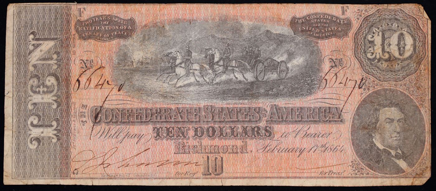 1864 $10 Confederate Note, T68 Grades vf++. Of great historical interest this is the last $10 currency notes issued by the Confederate States of America. The 7th and last issue of Confederate notes. Notes hand signed and numbered by Confederate soldiers and families. Printed and issued over 140 years ago during the Civil War. Depicts Confederate cabinet member Robert M. T. Hunter and features a detailed vignette of horse-drawn artillery. This large 7" x 3" Confederate $10 note is a genuine keepsake from one of the most significant periods in American history.