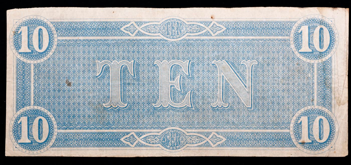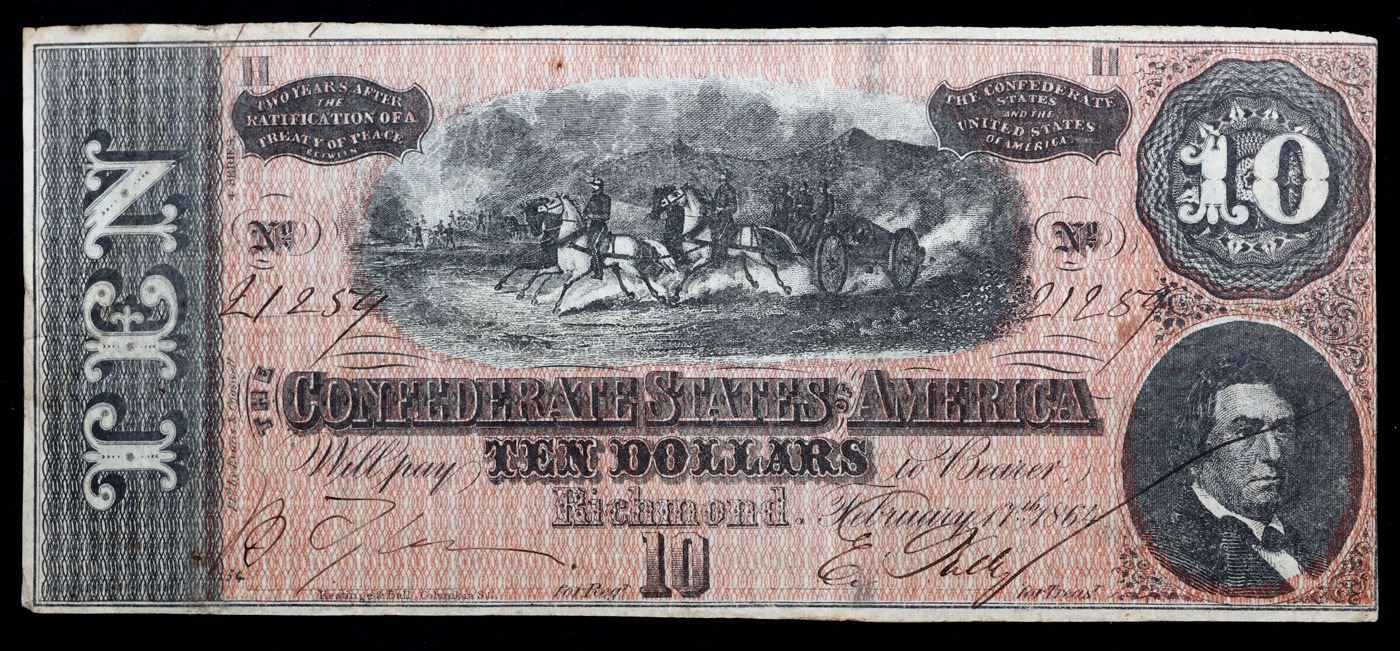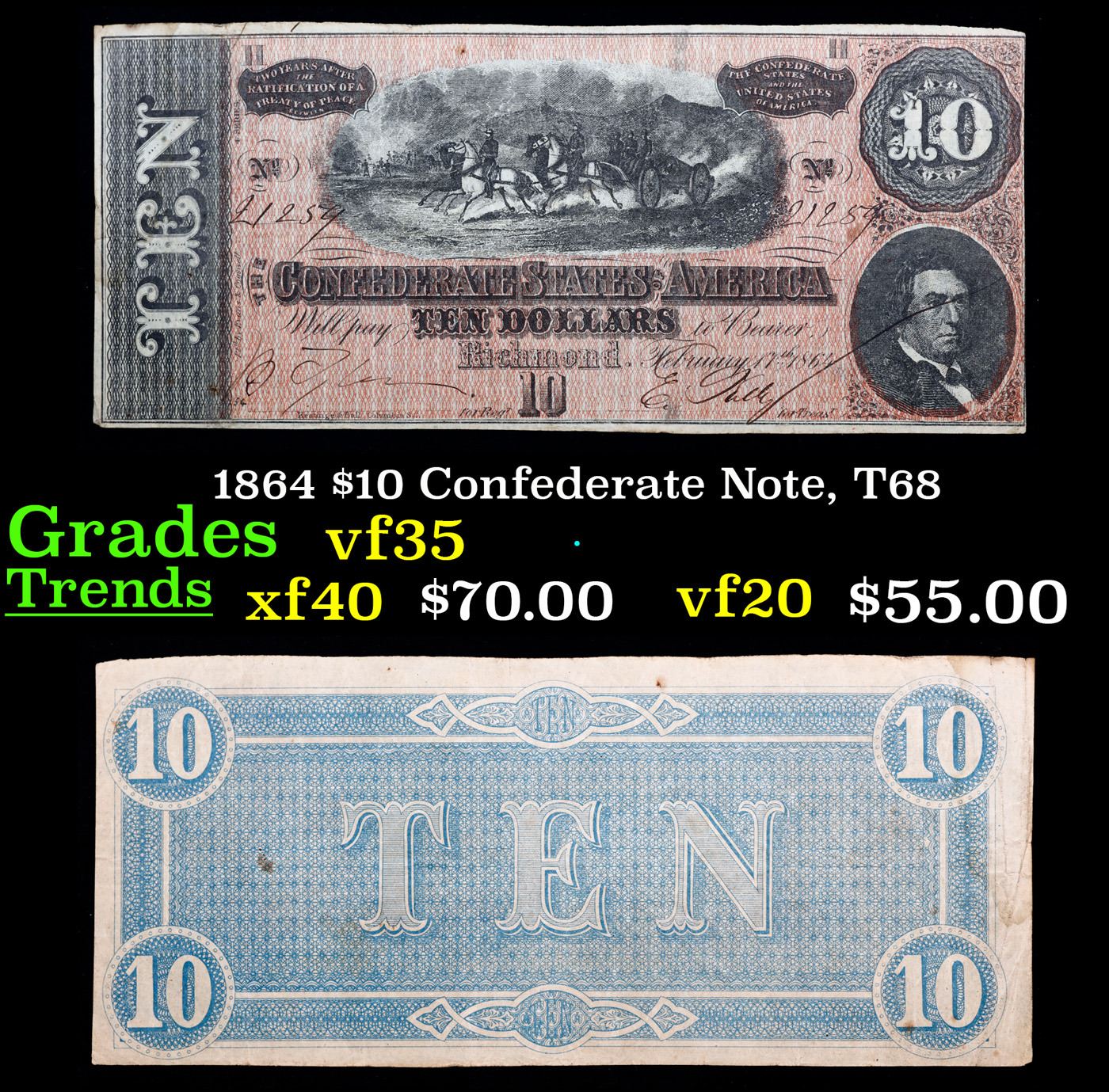 1864 $10 Confederate Note, T68 Grades vf++. Of great historical interest this is the last $10 currency notes issued by the Confederate States of America. The 7th and last issue of Confederate notes. Notes hand signed and numbered by Confederate soldiers and families. Printed and issued over 140 years ago during the Civil War. Depicts Confederate cabinet member Robert M. T. Hunter and features a detailed vignette of horse-drawn artillery. This large 7" x 3" Confederate $10 note is a genuine keepsake from one of the most significant periods in American history.
