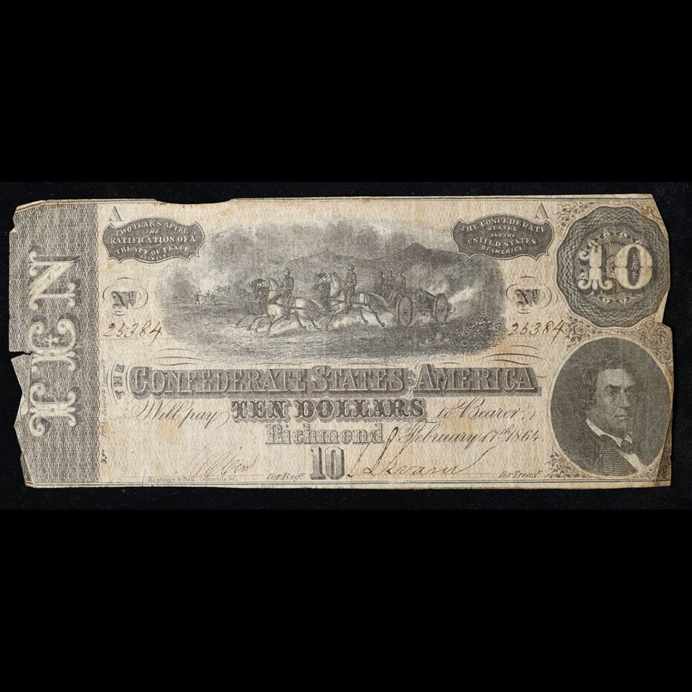 1864 $10 Confederate Note, T68 Grades vf+. Of great historical interest this is the last $10 currency notes issued by the Confederate States of America. The 7th and last issue of Confederate notes. Notes hand signed and numbered by Confederate soldiers and families. Printed and issued over 140 years ago during the Civil War. Depicts Confederate cabinet member Robert M. T. Hunter and features a detailed vignette of horse-drawn artillery. This large 7" x 3" Confederate $10 note is a genuine keepsake from one of the most significant periods in American history.
