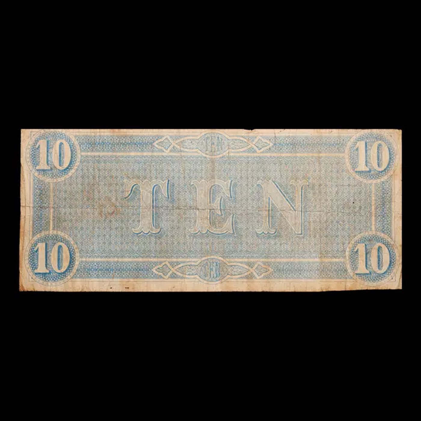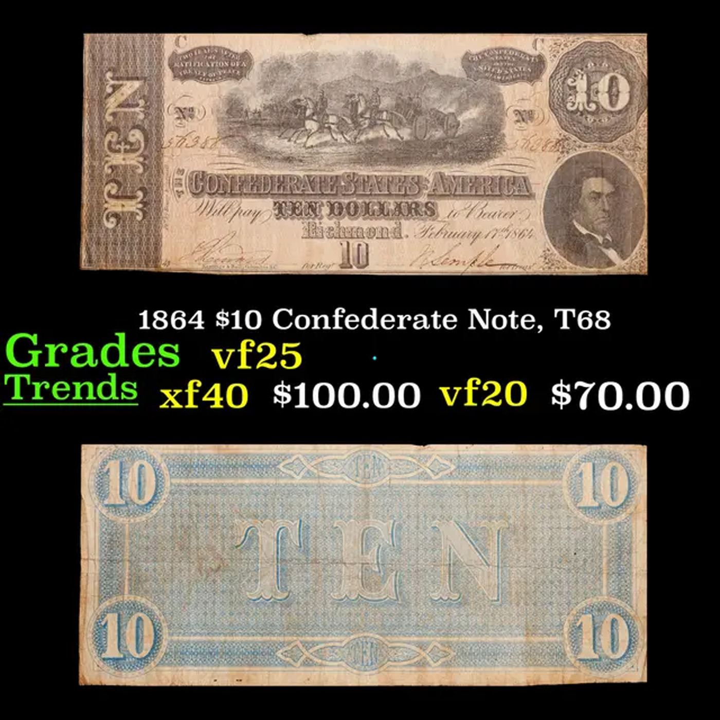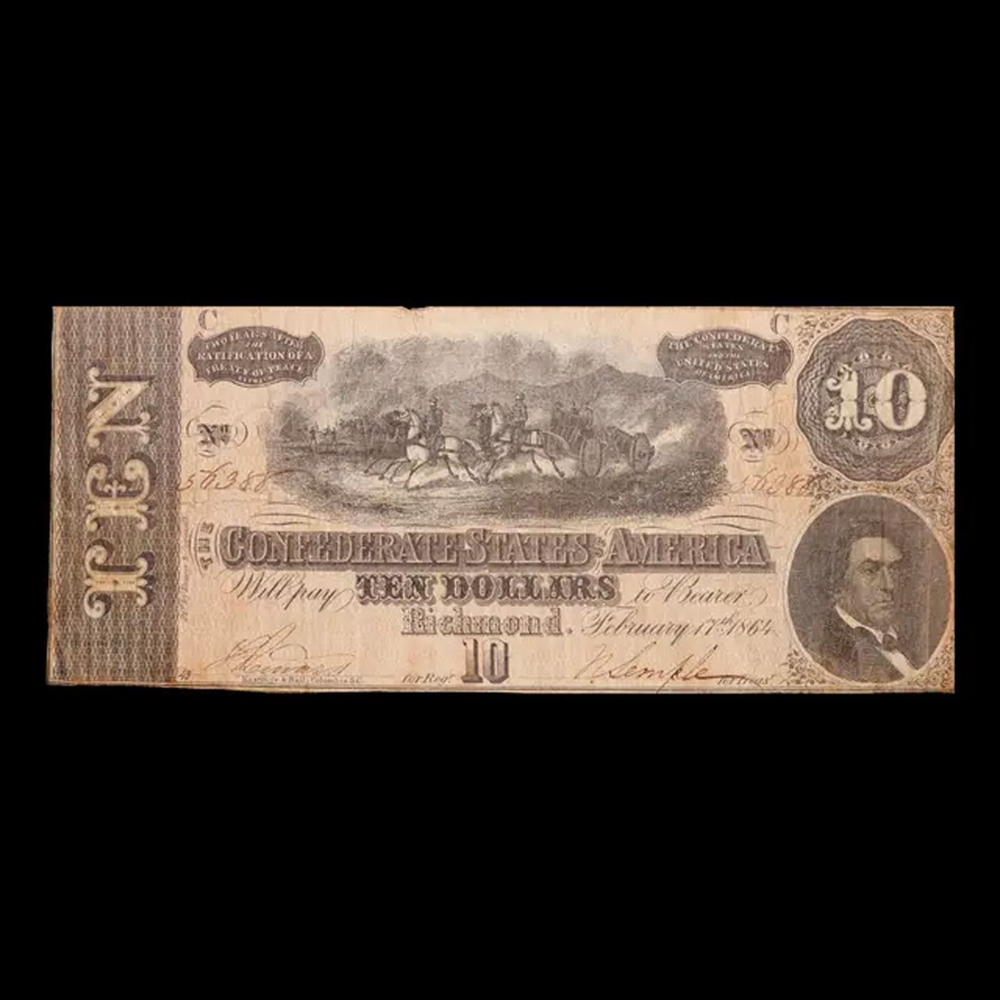 1864 $10 Confederate Note, T68 Grades vf+. Of great historical interest this is the last $10 currency notes issued by the Confederate States of America. The 7th and last issue of Confederate notes. Notes hand signed and numbered by Confederate soldiers and families. Printed and issued over 140 years ago during the Civil War. Depicts Confederate cabinet member Robert M. T. Hunter and features a detailed vignette of horse-drawn artillery. This large 7" x 3" Confederate $10 note is a genuine keepsake from one of the most significant periods in American history.