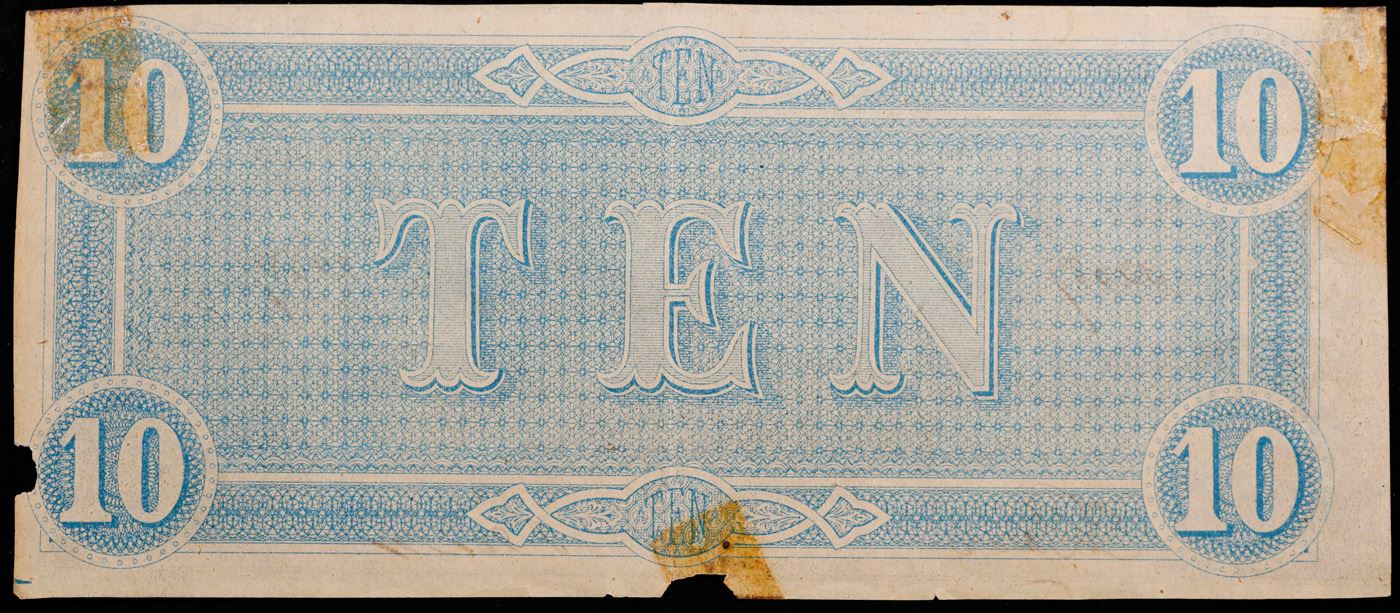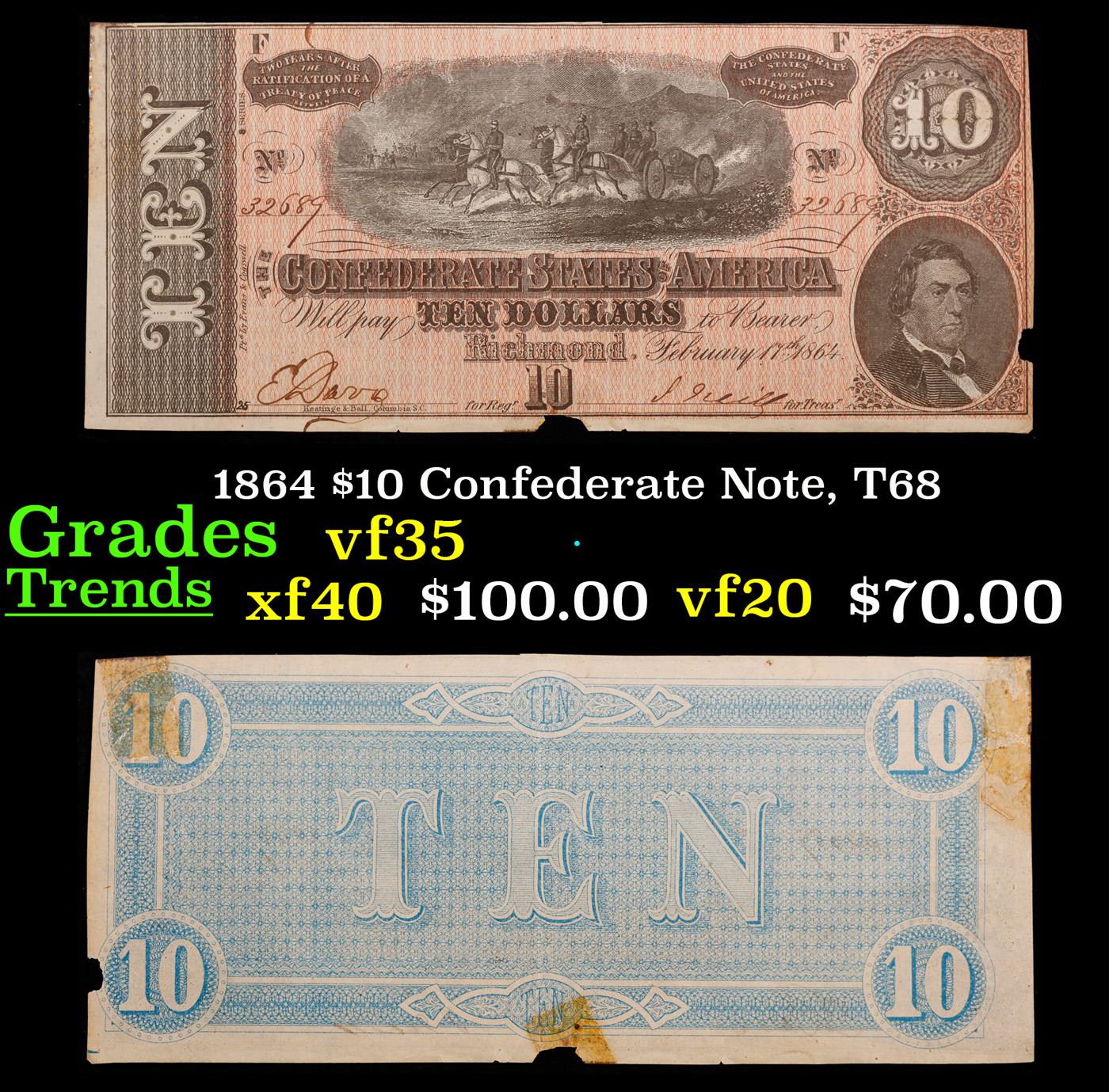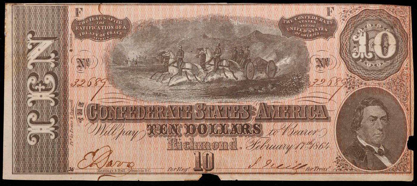 1864 $10 Confederate Note, T68 Grades vf++. Of great historical interest this is the last $10 currency notes issued by the Confederate States of America. The 7th and last issue of Confederate notes. Notes hand signed and numbered by Confederate soldiers and families. Printed and issued over 140 years ago during the Civil War. Depicts Confederate cabinet member Robert M. T. Hunter and features a detailed vignette of horse-drawn artillery. This large 7" x 3" Confederate $10 note is a genuine keepsake from one of the most significant periods in American history.