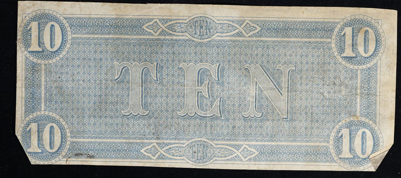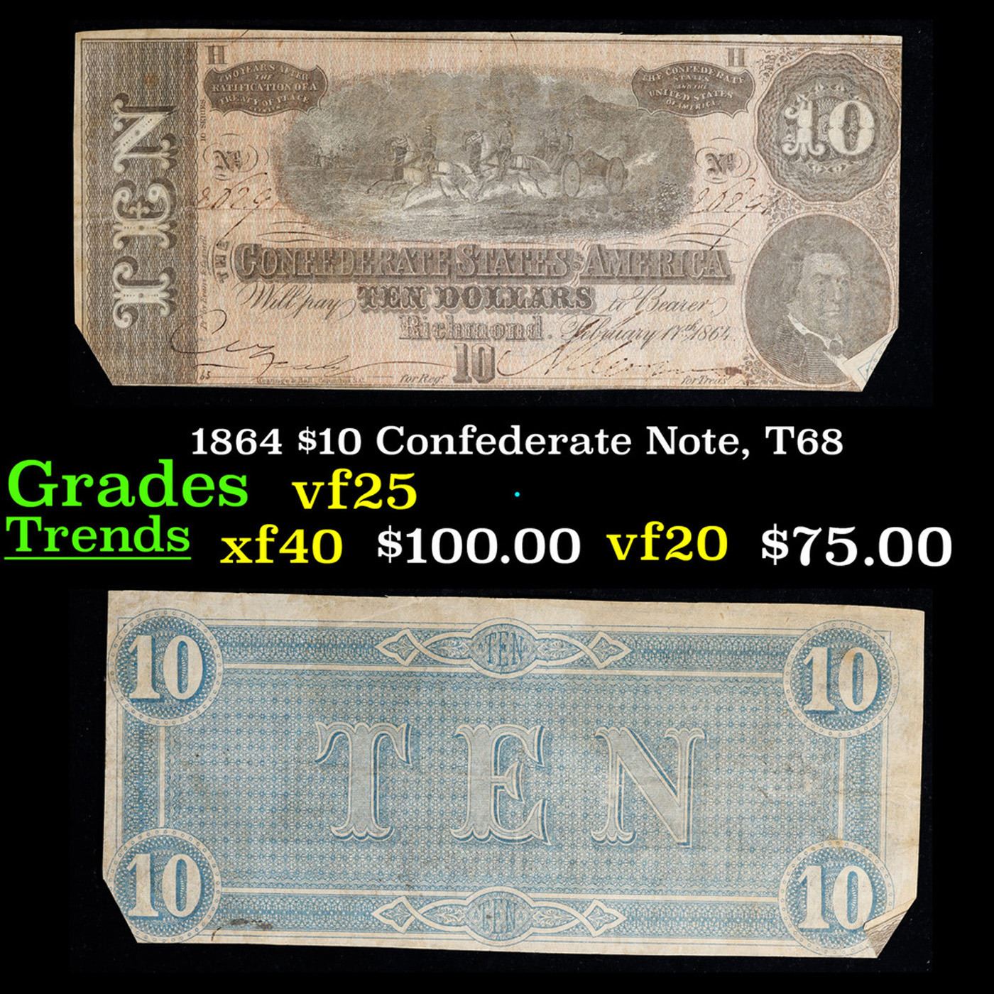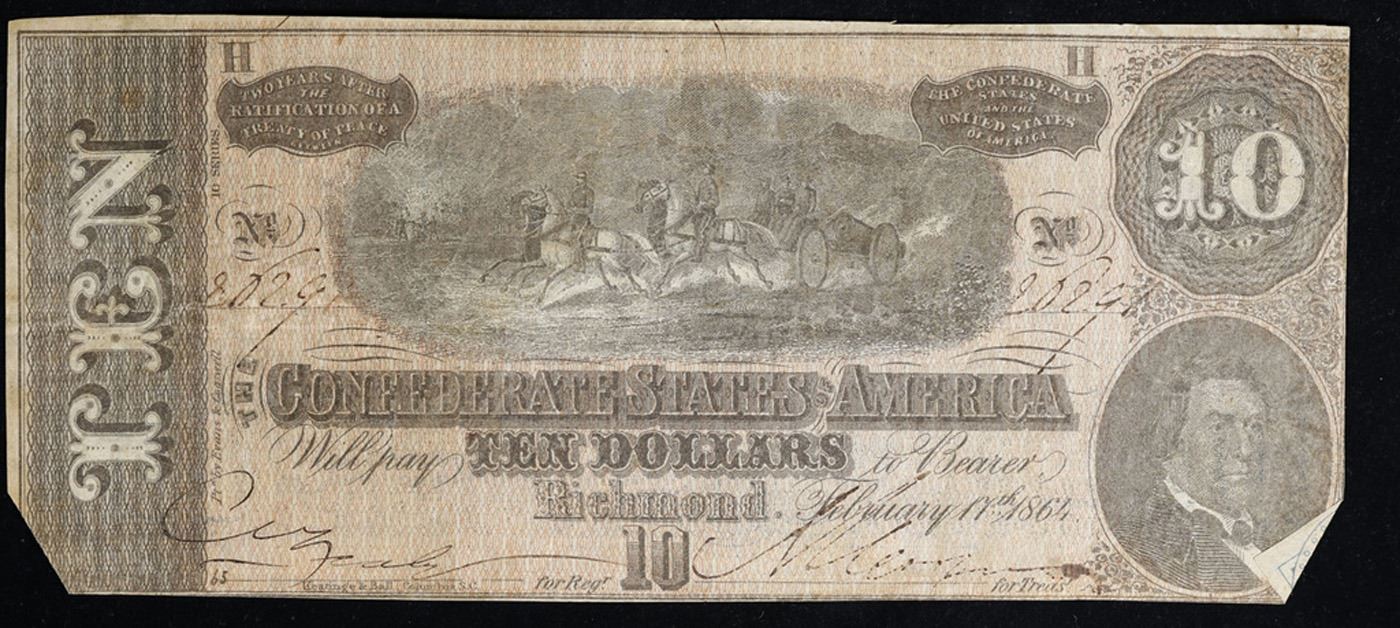 1864 $10 Confederate Note, T68 Grades vf+. Of great historical interest this is the last $10 currency notes issued by the Confederate States of America. The 7th and last issue of Confederate notes. Notes hand signed and numbered by Confederate soldiers and families. Printed and issued over 140 years ago during the Civil War. Depicts Confederate cabinet member Robert M. T. Hunter and features a detailed vignette of horse-drawn artillery. This large 7" x 3" Confederate $10 note is a genuine keepsake from one of the most significant periods in American history.