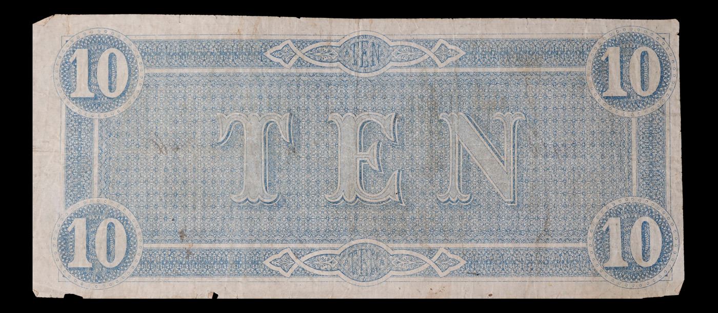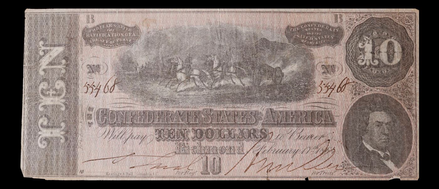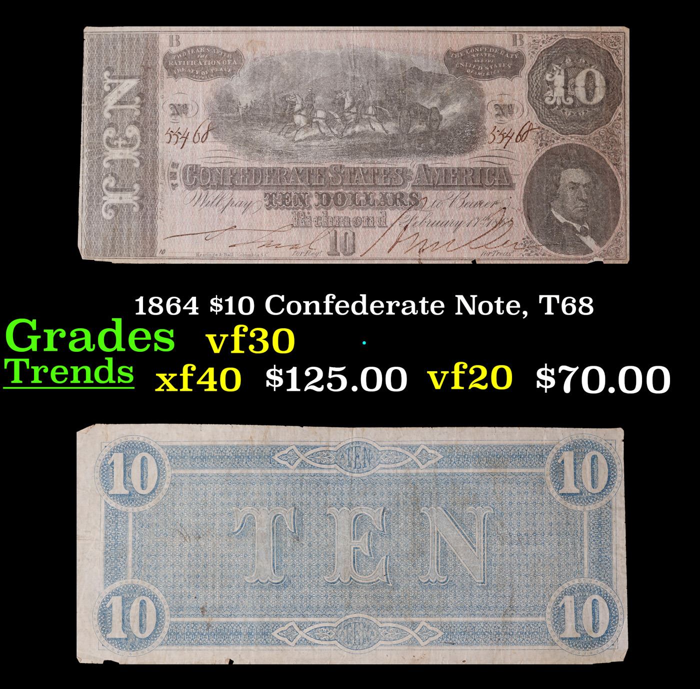 1864 $10 Confederate Note, T68 Grades vf++. Of great historical interest this is the last $10 currency notes issued by the Confederate States of America. The 7th and last issue of Confederate notes. Notes hand signed and numbered by Confederate soldiers and families. Printed and issued over 140 years ago during the Civil War. Depicts Confederate cabinet member Robert M. T. Hunter and features a detailed vignette of horse-drawn artillery. This large 7" x 3" Confederate $10 note is a genuine keepsake from one of the most significant periods in American history.