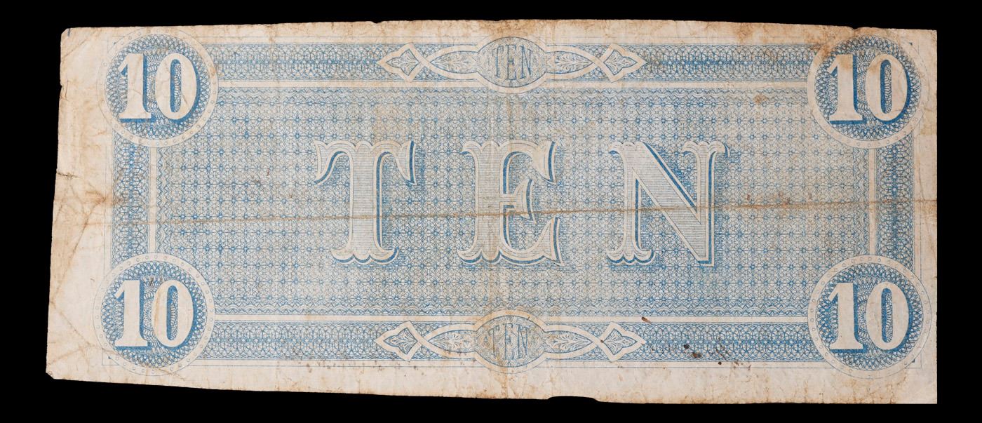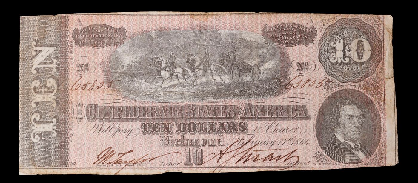 1864 $10 Confederate Note, T68 Grades vf++. Of great historical interest this is the last $10 currency notes issued by the Confederate States of America. The 7th and last issue of Confederate notes. Notes hand signed and numbered by Confederate soldiers and families. Printed and issued over 140 years ago during the Civil War. Depicts Confederate cabinet member Robert M. T. Hunter and features a detailed vignette of horse-drawn artillery. This large 7" x 3" Confederate $10 note is a genuine keepsake from one of the most significant periods in American history.