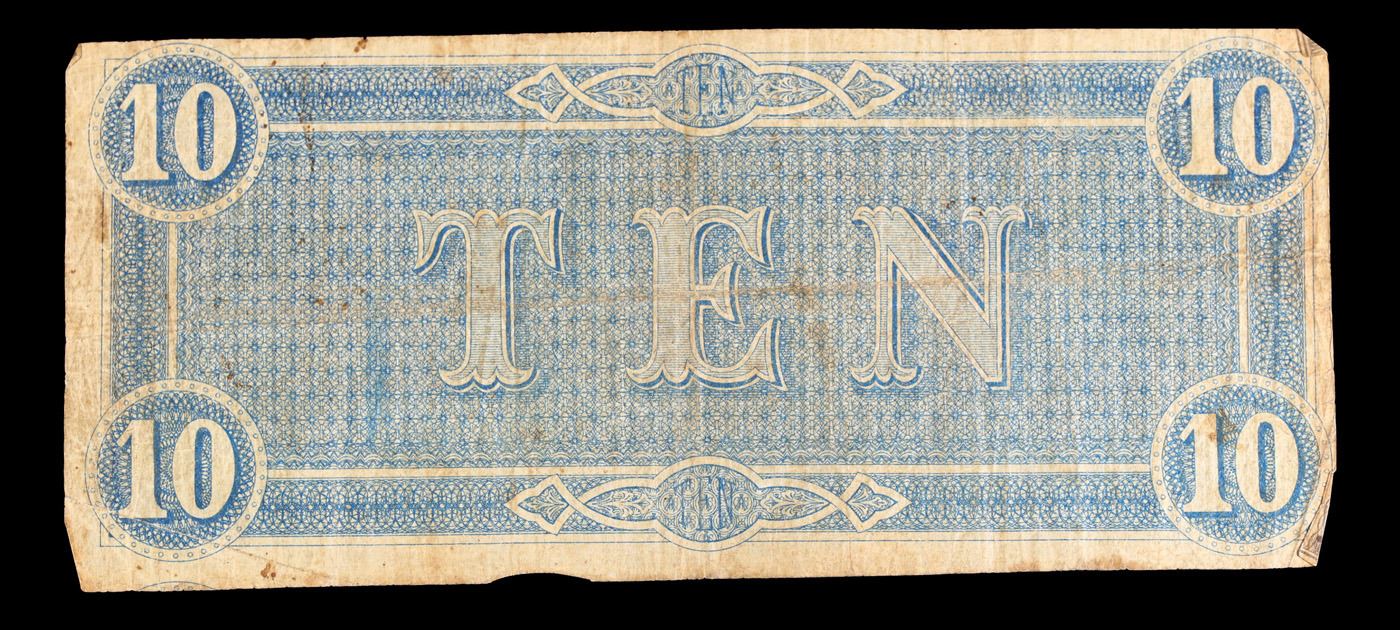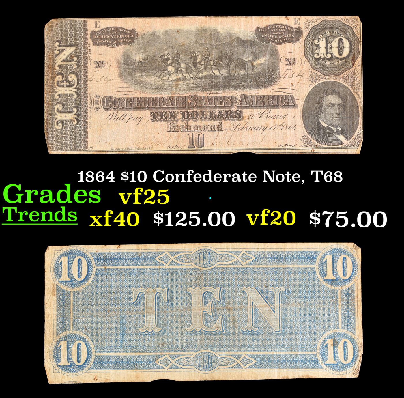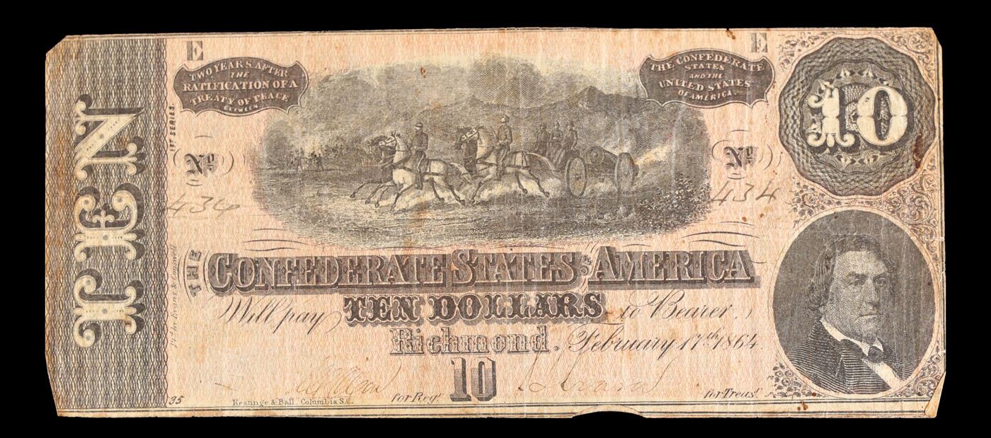 1864 $10 Confederate Note, T68 Grades vf+. Of great historical interest this is the last $10 currency notes issued by the Confederate States of America. The 7th and last issue of Confederate notes. Notes hand signed and numbered by Confederate soldiers and families. Printed and issued over 140 years ago during the Civil War. Depicts Confederate cabinet member Robert M. T. Hunter and features a detailed vignette of horse-drawn artillery. This large 7" x 3" Confederate $10 note is a genuine keepsake from one of the most significant periods in American history.