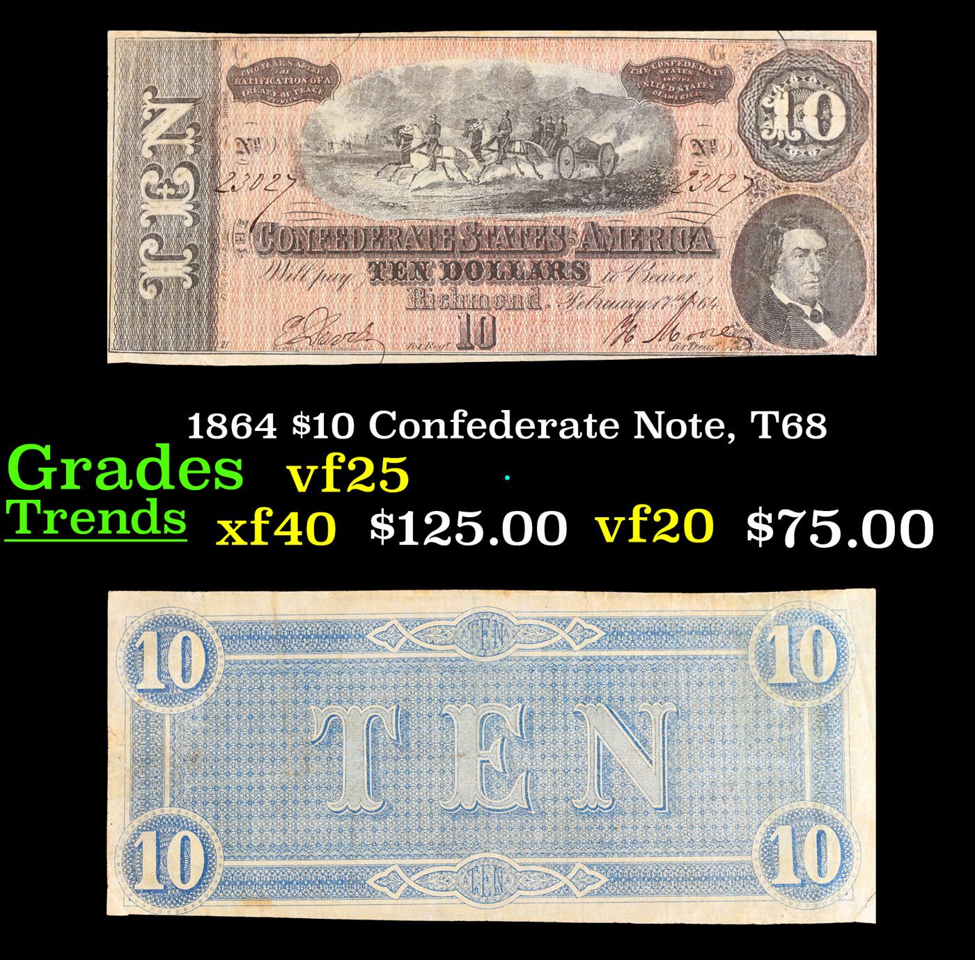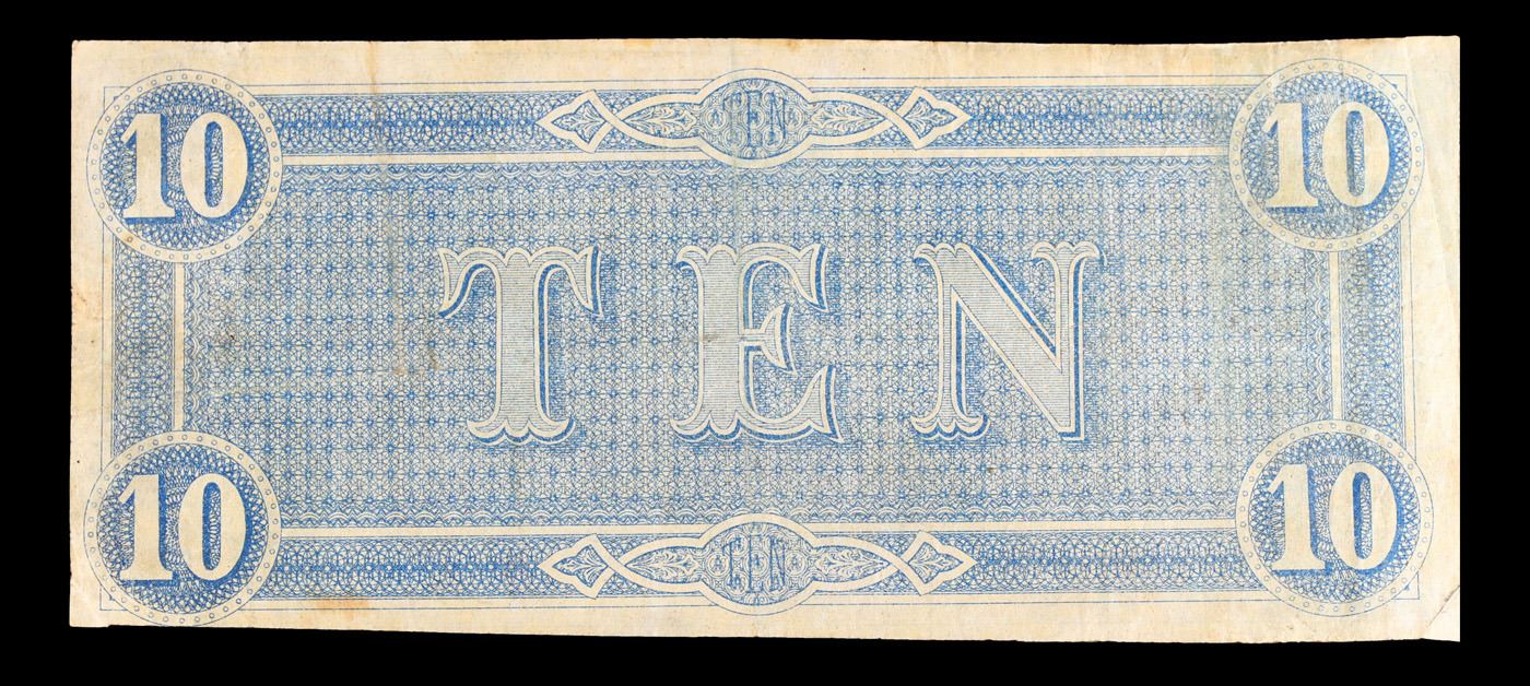 1864 $10 Confederate Note, T68 Grades vf+