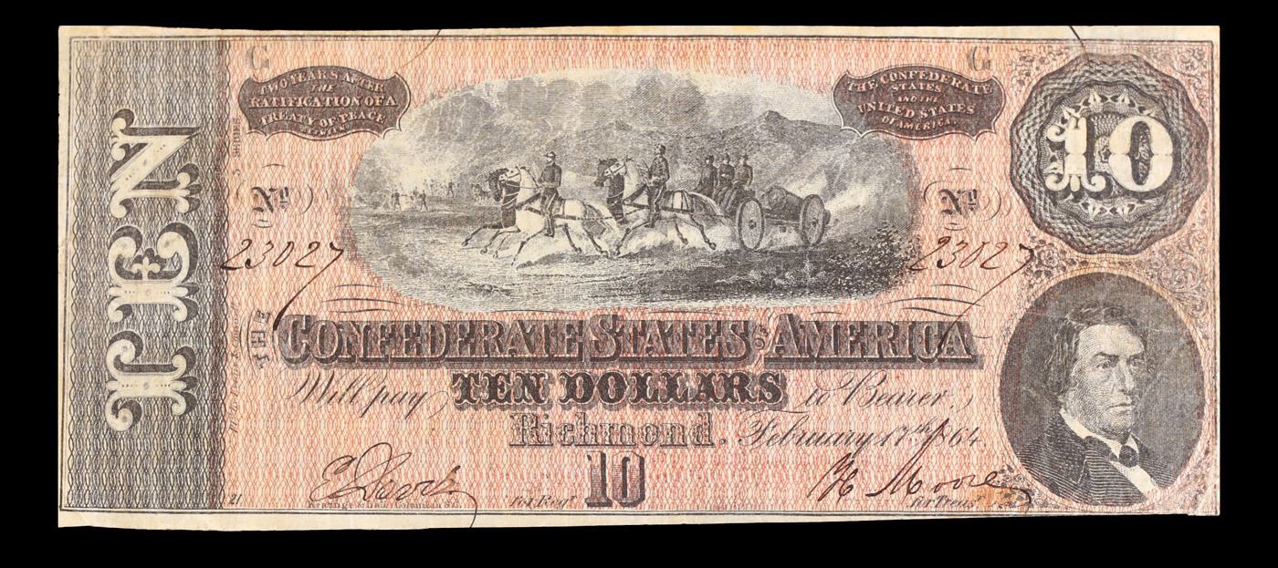 1864 $10 Confederate Note, T68 Grades vf+. Of great historical interest this is the last $10 currency notes issued by the Confederate States of America. The 7th and last issue of Confederate notes. Notes hand signed and numbered by Confederate soldiers and families. Printed and issued over 140 years ago during the Civil War. Depicts Confederate cabinet member Robert M. T. Hunter and features a detailed vignette of horse-drawn artillery. This large 7" x 3" Confederate $10 note is a genuine keepsake from one of the most significant periods in American history.