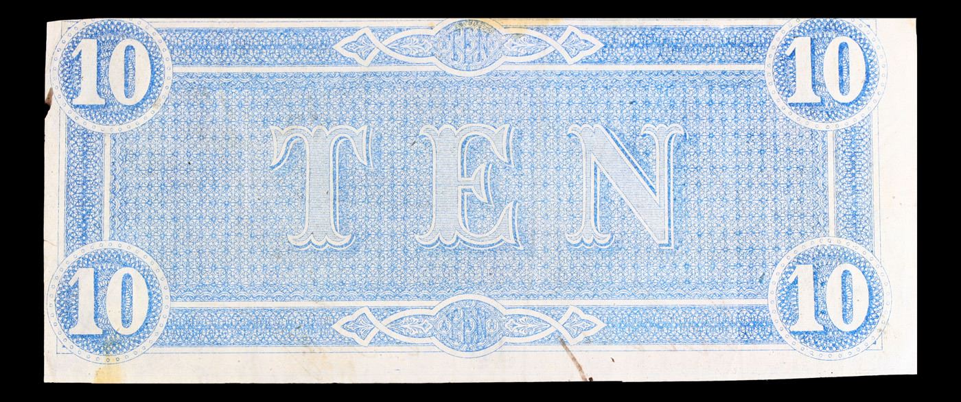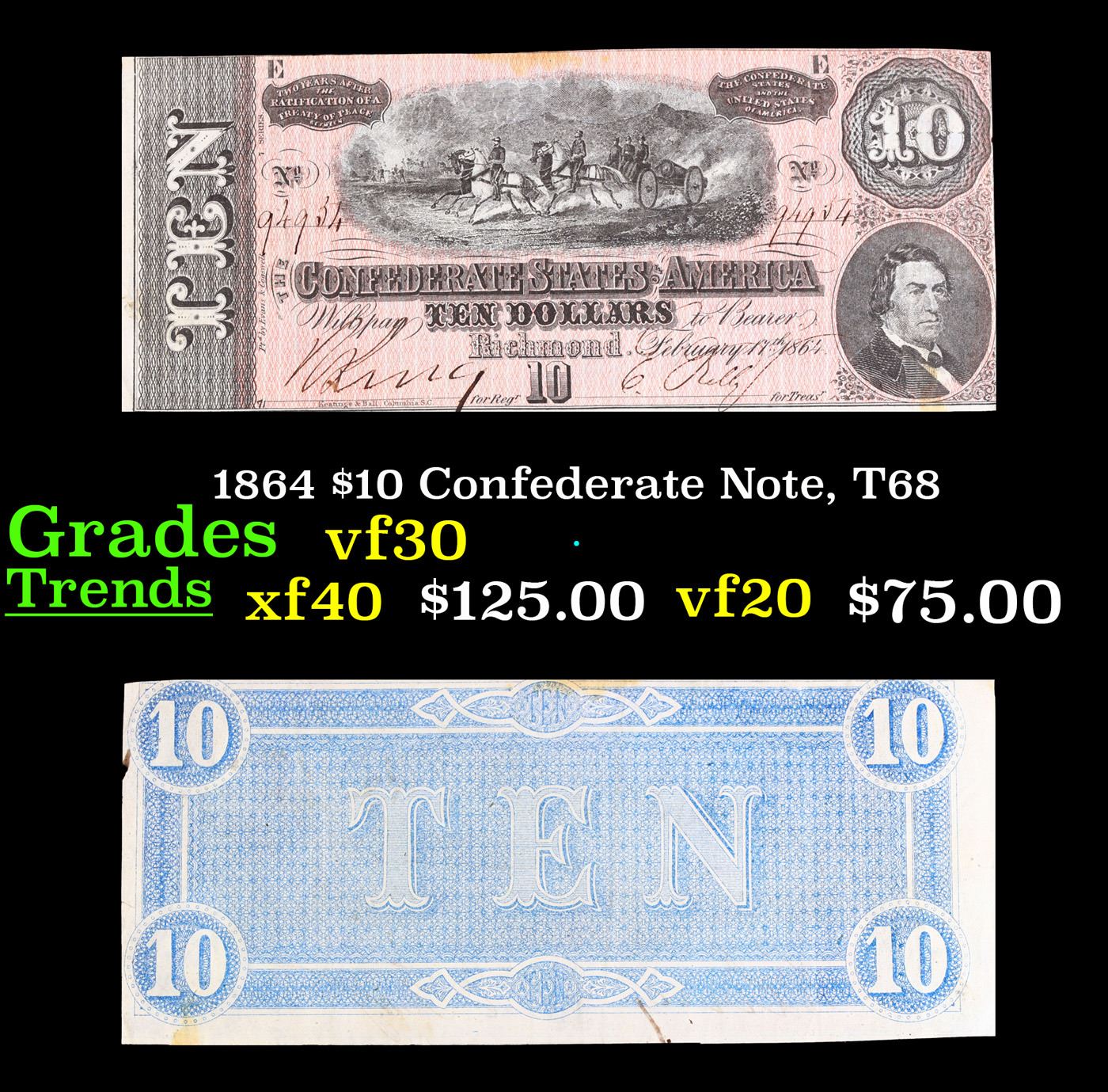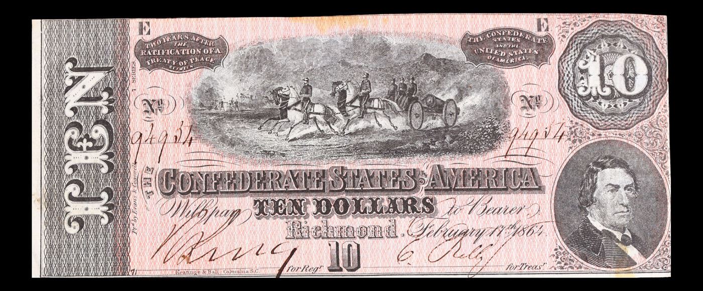1864 $10 Confederate Note, T68 Grades vf++. Of great historical interest this is the last $10 currency notes issued by the Confederate States of America. The 7th and last issue of Confederate notes. Notes hand signed and numbered by Confederate soldiers and families. Printed and issued over 140 years ago during the Civil War. Depicts Confederate cabinet member Robert M. T. Hunter and features a detailed vignette of horse-drawn artillery. This large 7" x 3" Confederate $10 note is a genuine keepsake from one of the most significant periods in American history.