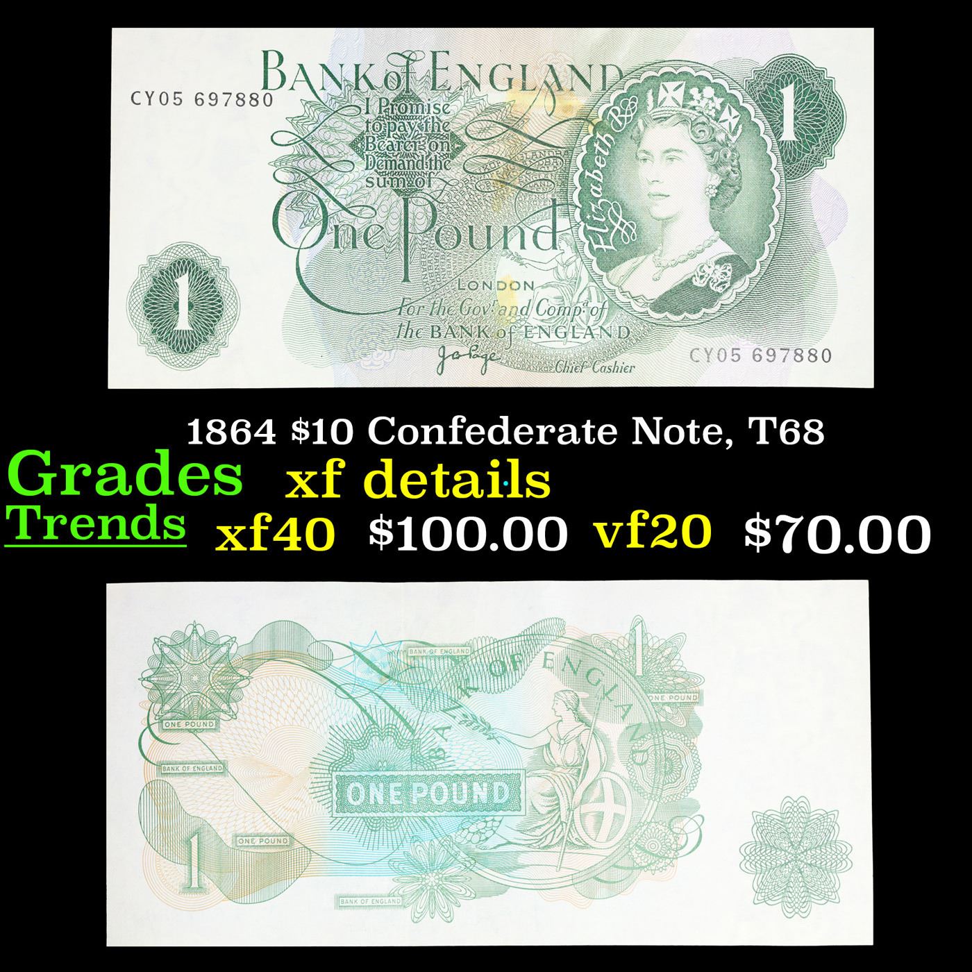 1864 $10 Confederate Note, T68 Grades xf details. Of great historical interest this is the last $10 currency notes issued by the Confederate States of America. The 7th and last issue of Confederate notes. Notes hand signed and numbered by Confederate soldiers and families. Printed and issued over 140 years ago during the Civil War. Depicts Confederate cabinet member Robert M. T. Hunter and features a detailed vignette of horse-drawn artillery. This large 7" x 3" Confederate $10 note is a genuine keepsake from one of the most significant periods in American history.