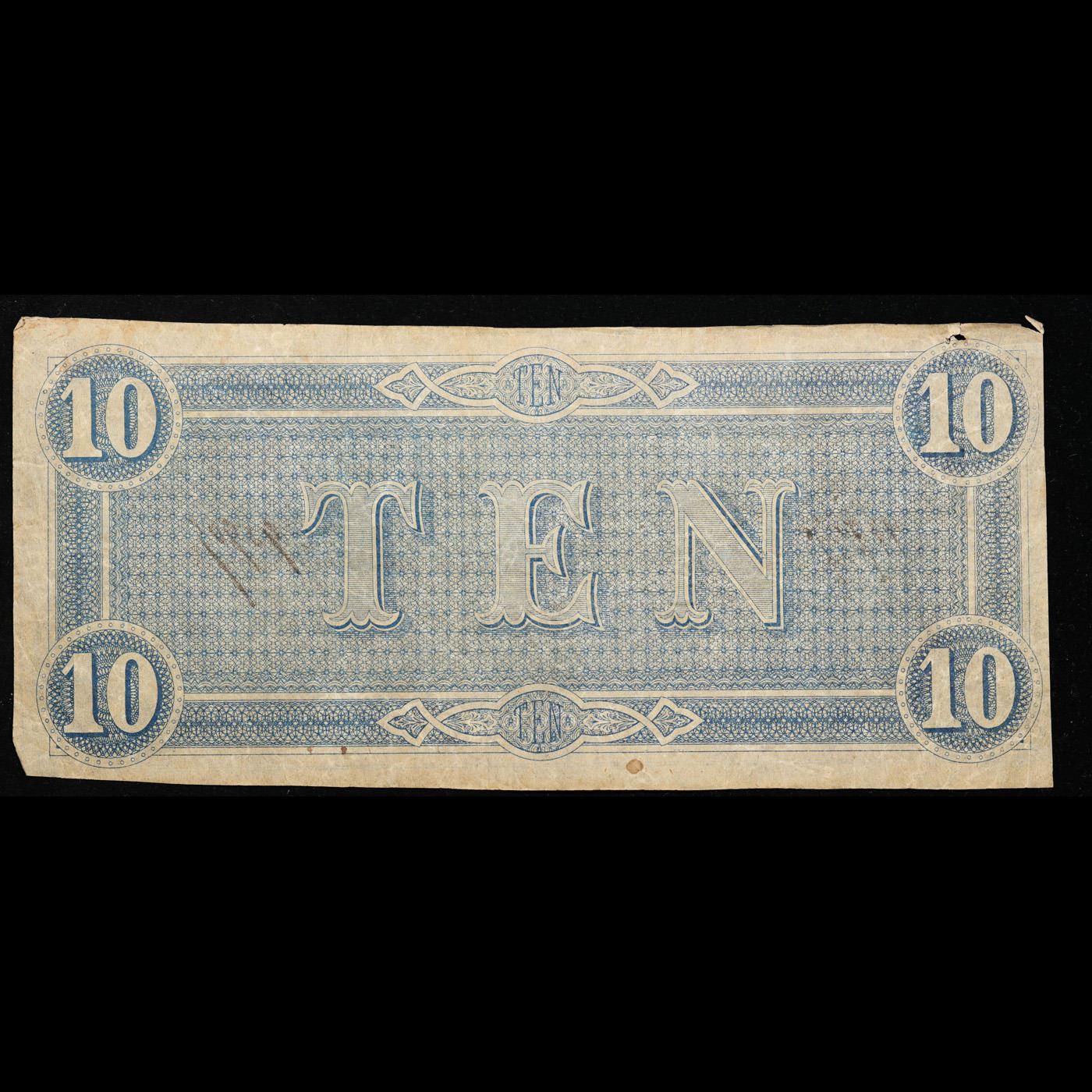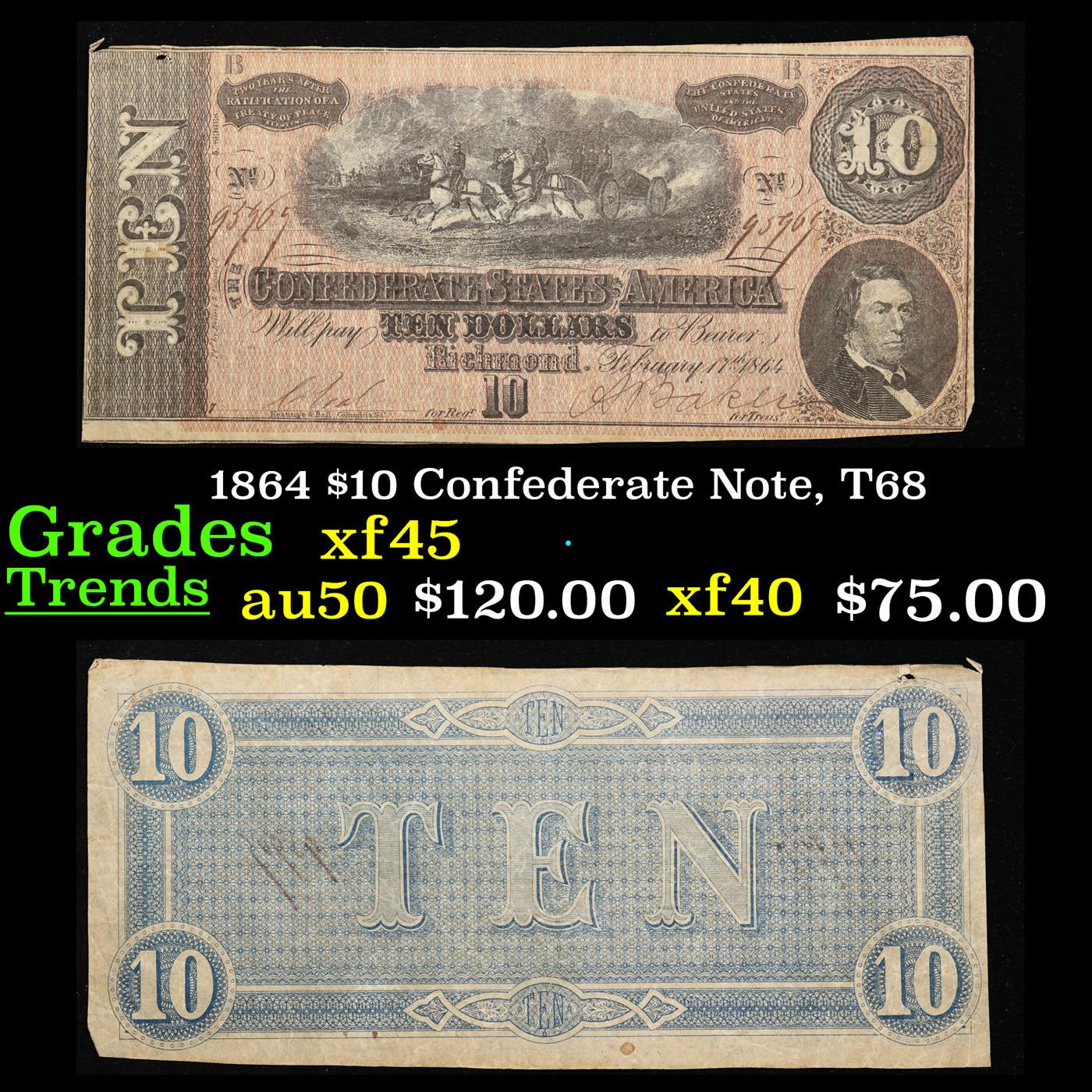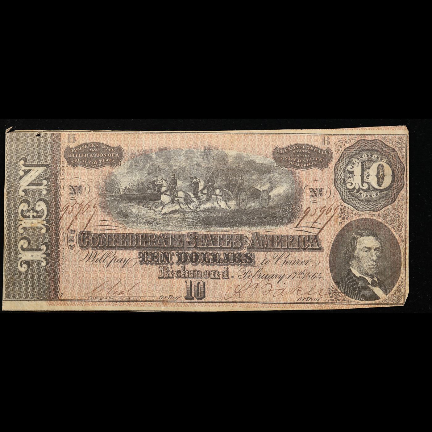 1864 $10 Confederate Note, T68 Grades xf+. Of great historical interest this is the last $10 currency notes issued by the Confederate States of America. The 7th and last issue of Confederate notes. Notes hand signed and numbered by Confederate soldiers and families. Printed and issued over 140 years ago during the Civil War. Depicts Confederate cabinet member Robert M. T. Hunter and features a detailed vignette of horse-drawn artillery. This large 7" x 3" Confederate $10 note is a genuine keepsake from one of the most significant periods in American history.