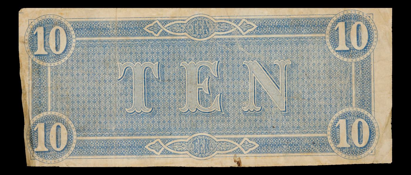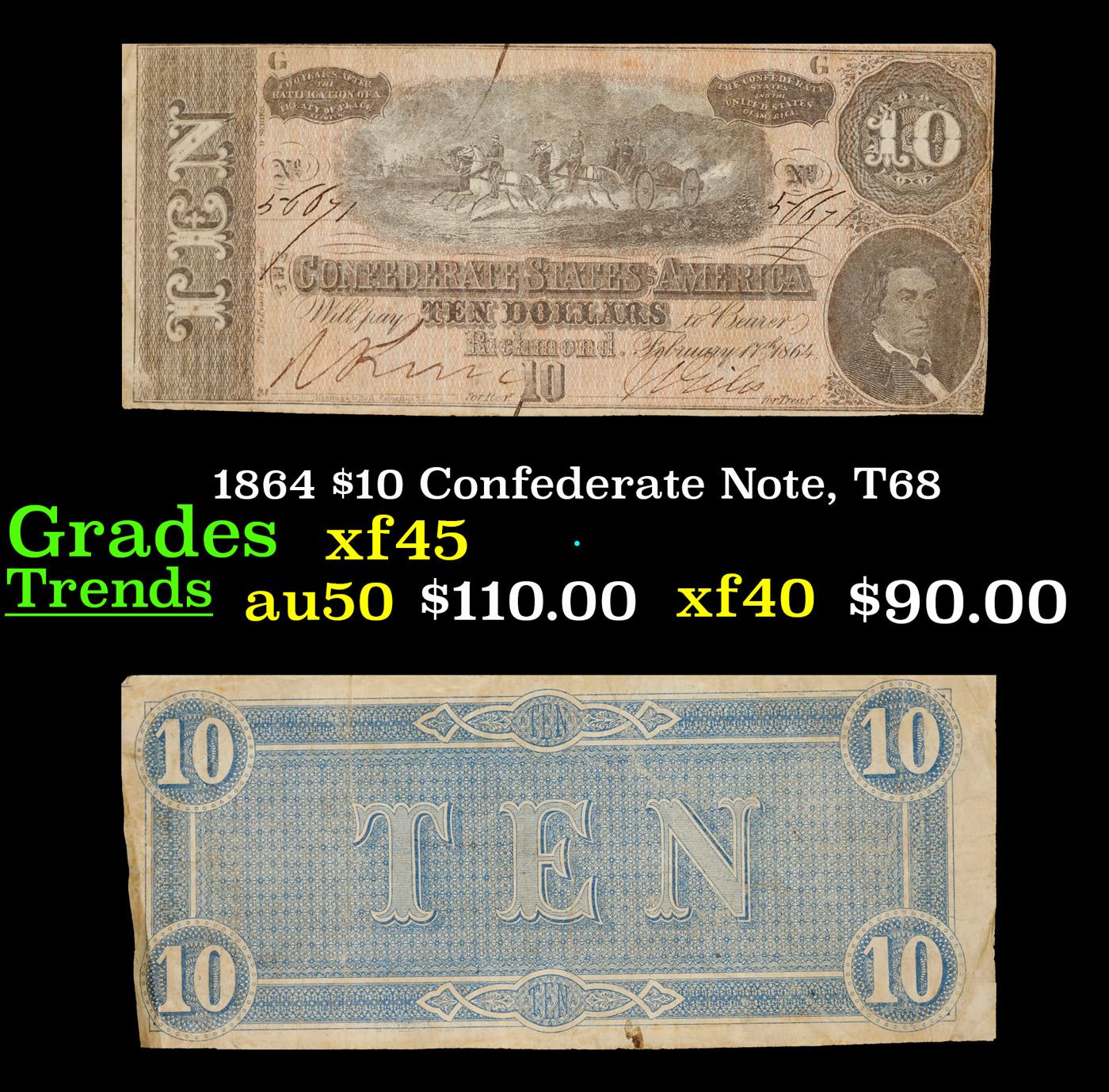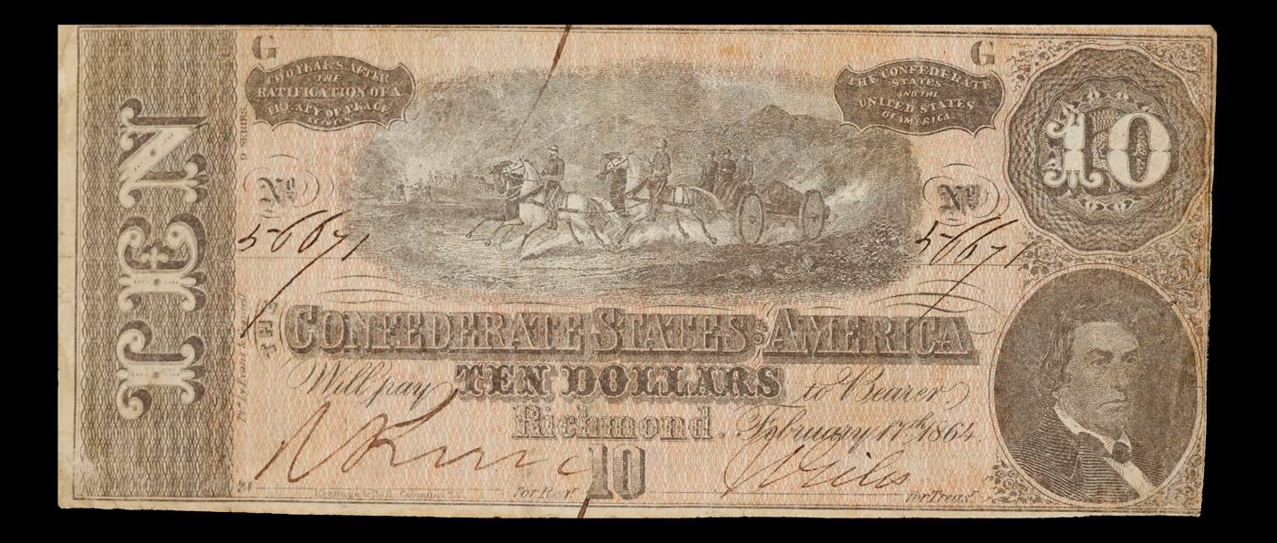 1864 $10 Confederate Note, T68 Grades xf+. Of great historical interest this is the last $10 currency notes issued by the Confederate States of America. The 7th and last issue of Confederate notes. Notes hand signed and numbered by Confederate soldiers and families. Printed and issued over 140 years ago during the Civil War. Depicts Confederate cabinet member Robert M. T. Hunter and features a detailed vignette of horse-drawn artillery. This large 7" x 3" Confederate $10 note is a genuine keepsake from one of the most significant periods in American history.