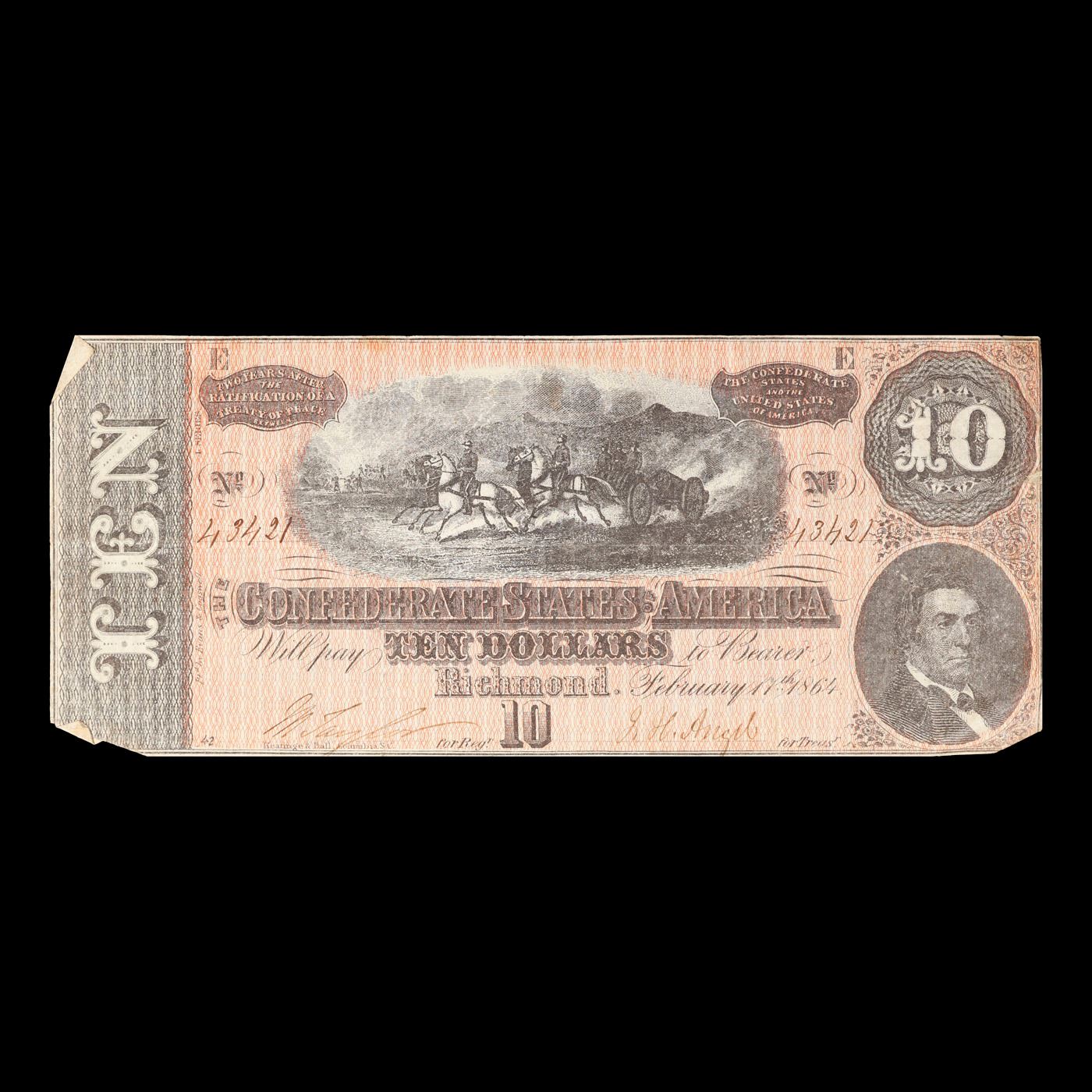 1864 $10 Confederate States Note, T68 Grades Choice AU. Of great historical interest this is the last $10 currency notes issued by the Confederate States of America. The 7th and last issue of Confederate notes. Notes hand signed and numbered by Confederate soldiers and families. Printed and issued over 140 years ago during the Civil War. Depicts Confederate cabinet member Robert M. T. Hunter and features a detailed vignette of horse-drawn artillery. This large 7" x 3" Confederate $10 note is a genuine keepsake from one of the most significant periods in American history.