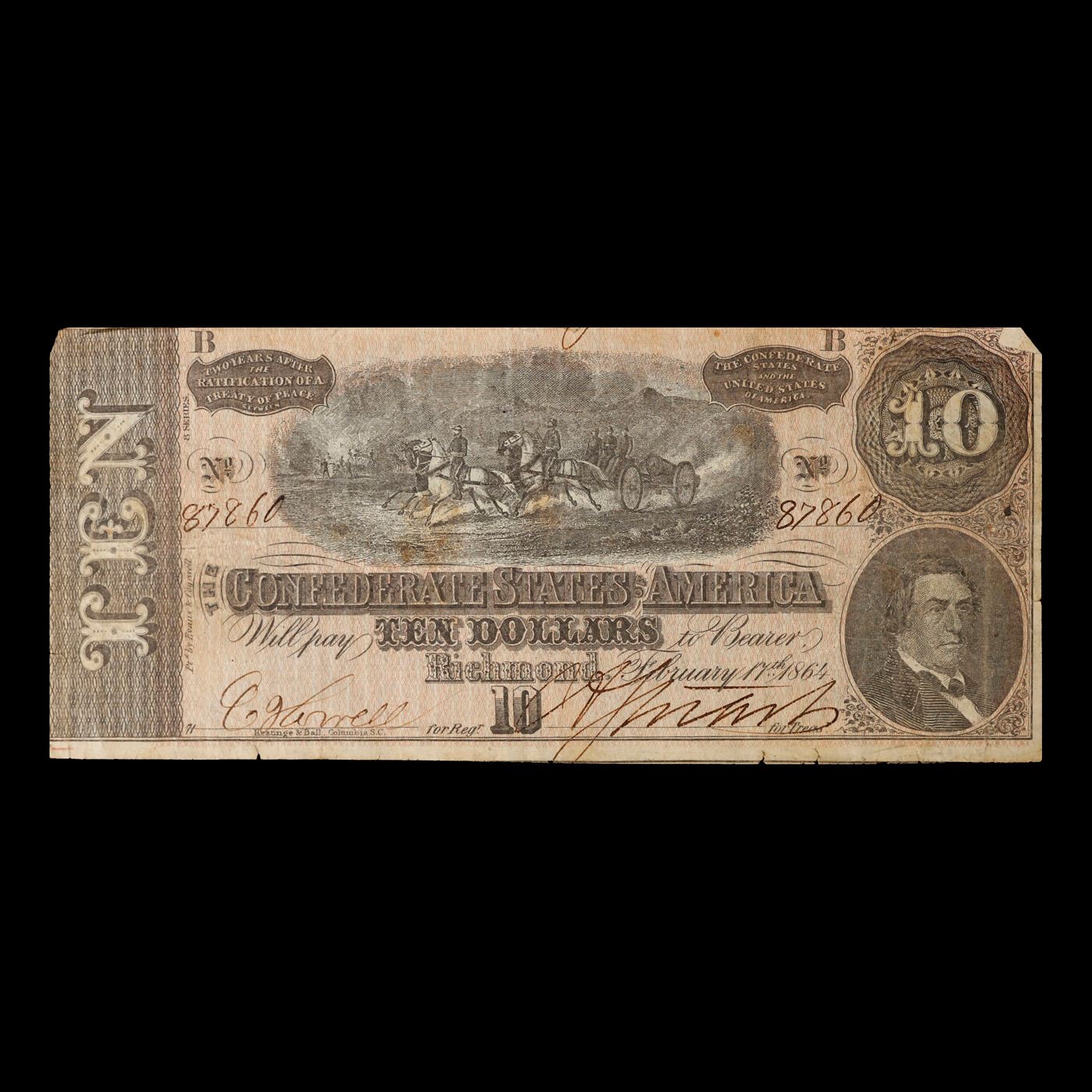 1864 $10 Confederate States Note, T68 Grades Select AU. Of great historical interest this is the last $10 currency notes issued by the Confederate States of America. The 7th and last issue of Confederate notes. Notes hand signed and numbered by Confederate soldiers and families. Printed and issued over 140 years ago during the Civil War. Depicts Confederate cabinet member Robert M. T. Hunter and features a detailed vignette of horse-drawn artillery. This large 7" x 3" Confederate $10 note is a genuine keepsake from one of the most significant periods in American history.