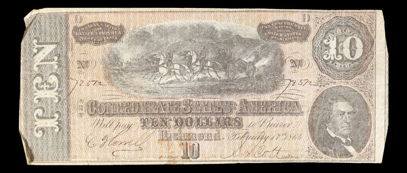 1864 $10 Confederate States Note, T68 Grades vf++. Of great historical interest this is the last $10 currency notes issued by the Confederate States of America. The 7th and last issue of Confederate notes. Notes hand signed and numbered by Confederate soldiers and families. Printed and issued over 140 years ago during the Civil War. Depicts Confederate cabinet member Robert M. T. Hunter and features a detailed vignette of horse-drawn artillery. This large 7" x 3" Confederate $10 note is a genuine keepsake from one of the most significant periods in American history.