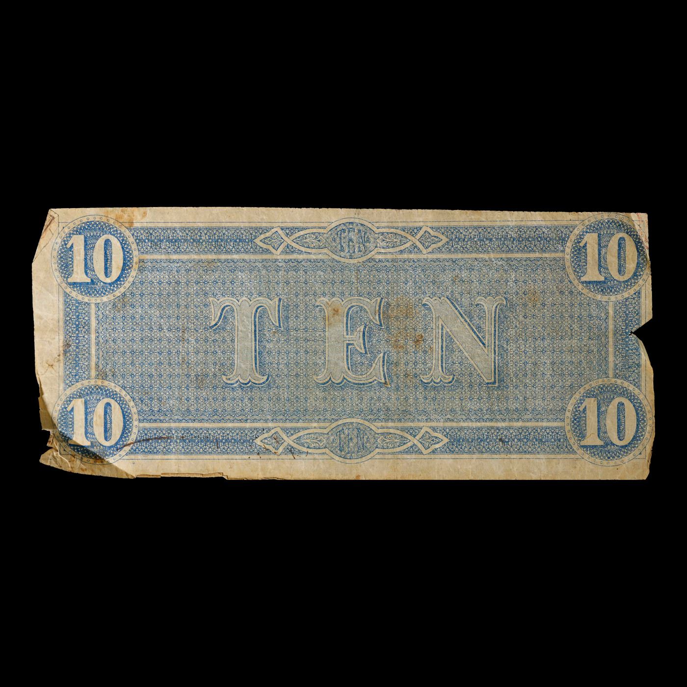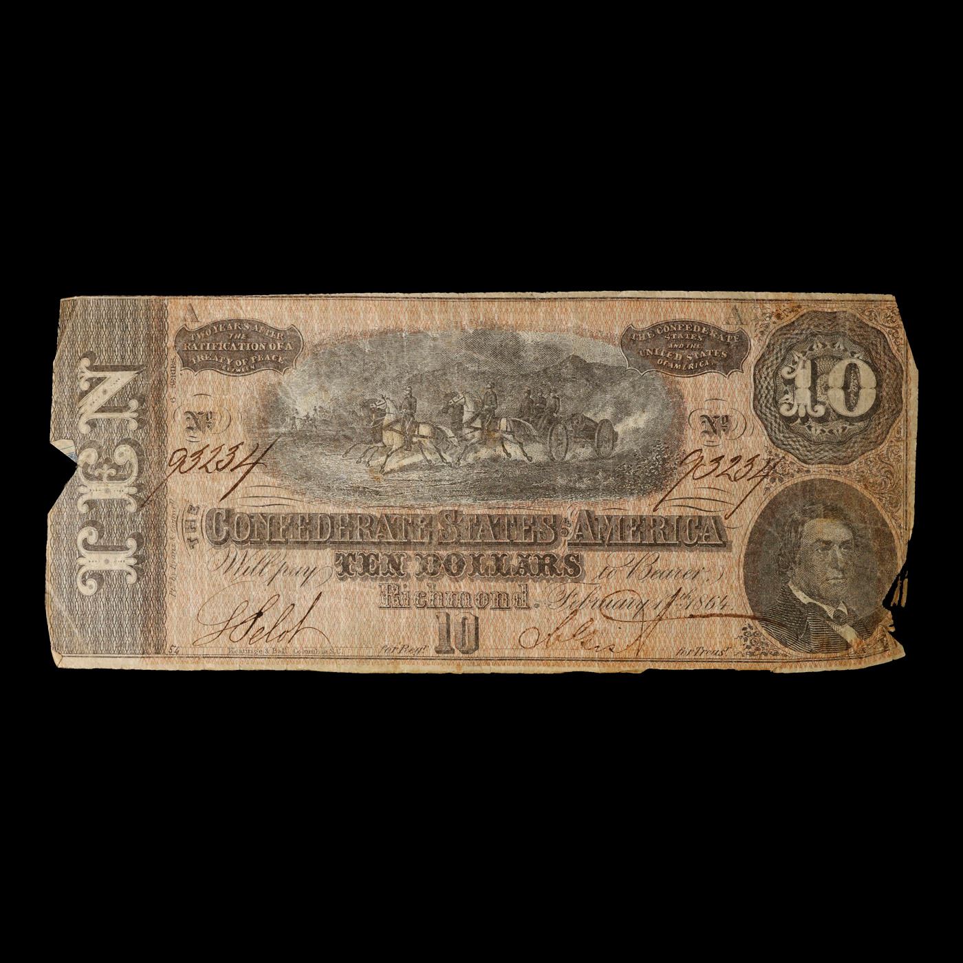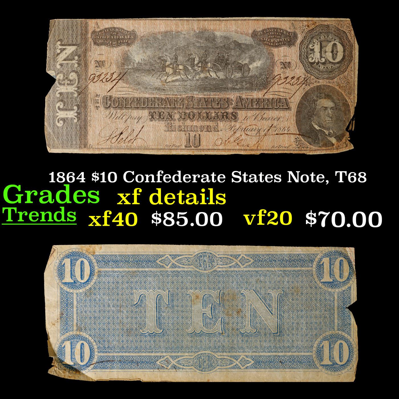 1864 $10 Confederate States Note, T68 Grades xf details. Of great historical interest this is the last $10 currency notes issued by the Confederate States of America. The 7th and last issue of Confederate notes. Notes hand signed and numbered by Confederate soldiers and families. Printed and issued over 140 years ago during the Civil War. Depicts Confederate cabinet member Robert M. T. Hunter and features a detailed vignette of horse-drawn artillery. This large 7" x 3" Confederate $10 note is a genuine keepsake from one of the most significant periods in American history.