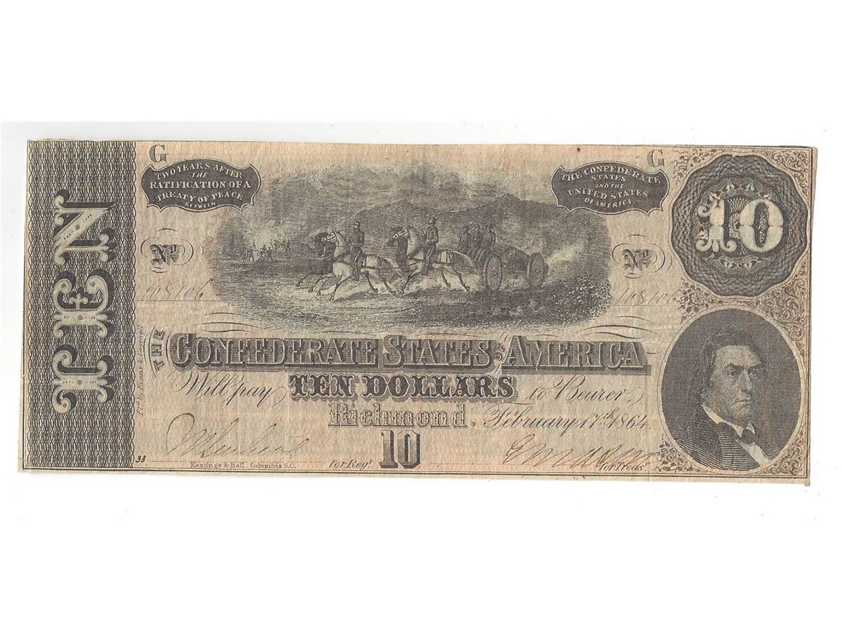 One 1864 $10 Confederate States of America Bank Note.