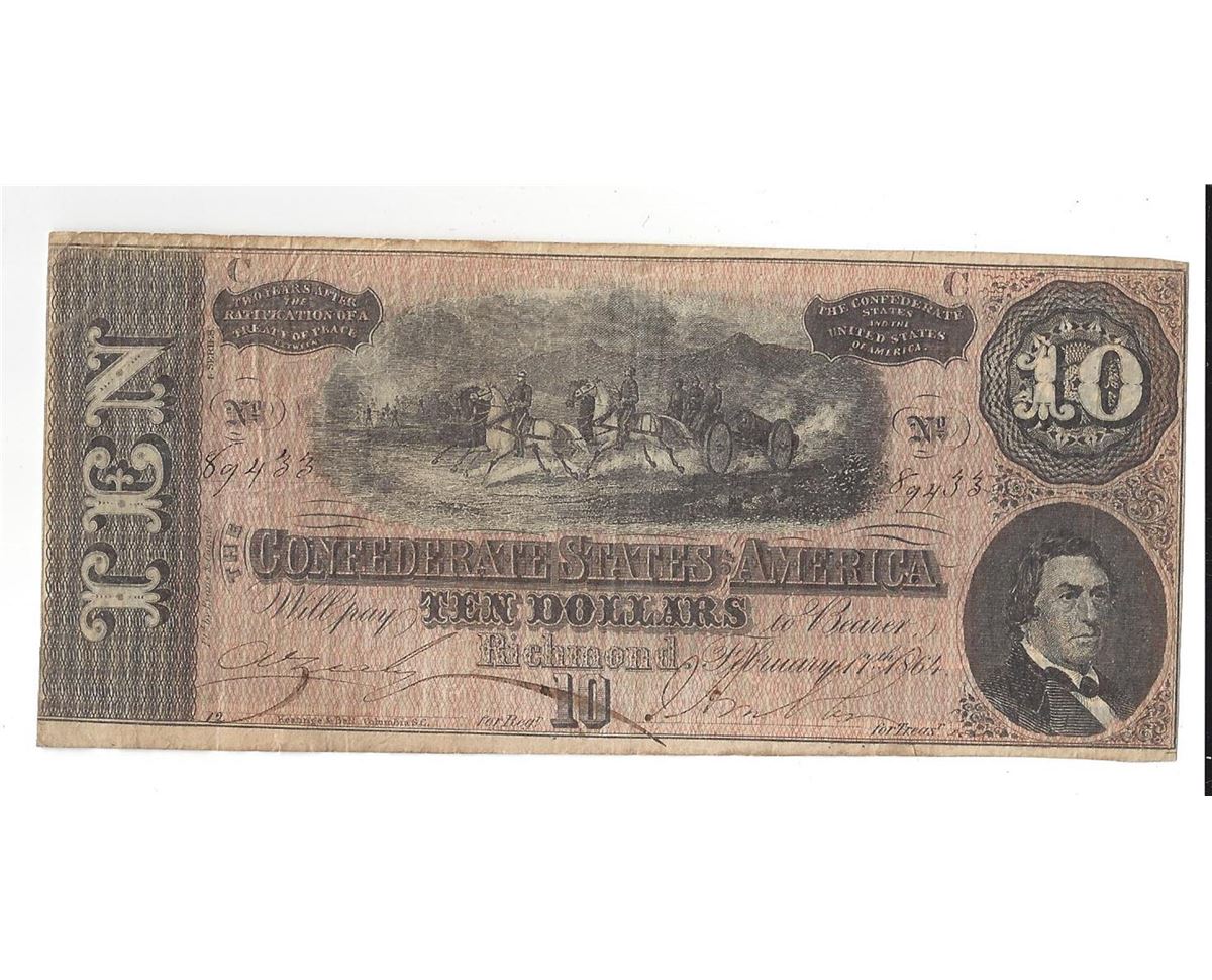 One 1864 $10 Confederate States of America Bank Note.