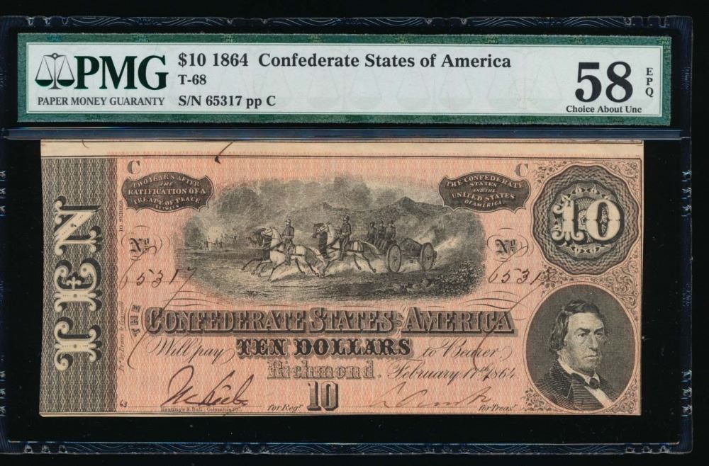 One 1864 $10 Confederate States of America Note PCGS 58EPQ.