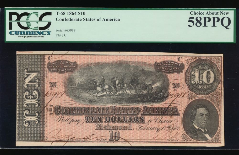 One 1864 $10 Confederate States of America Note PCGS 58PPQ.