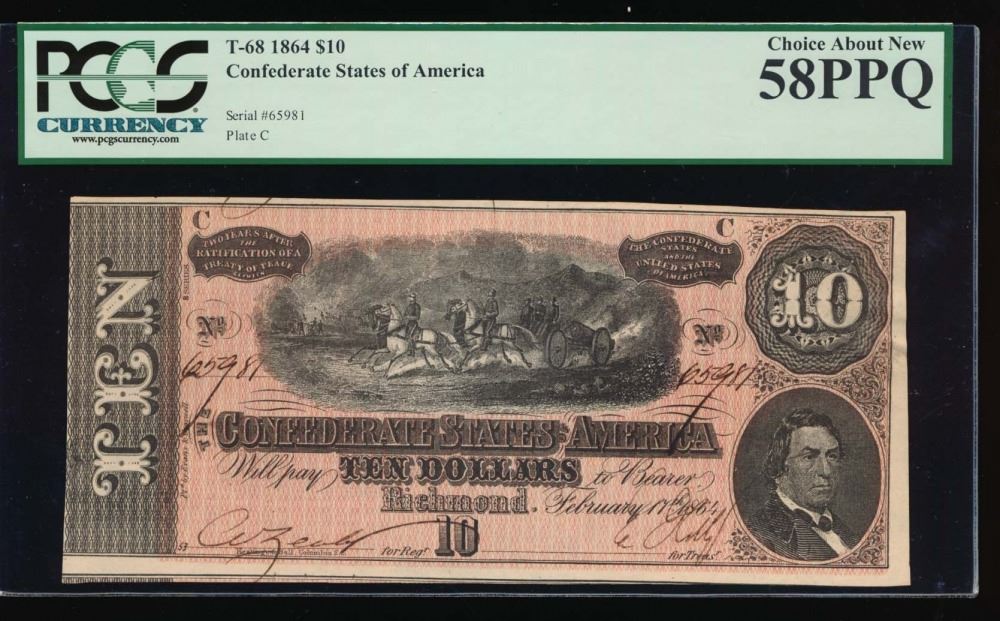 One 1864 $10 Confederate States of America Note PCGS 58PPQ.