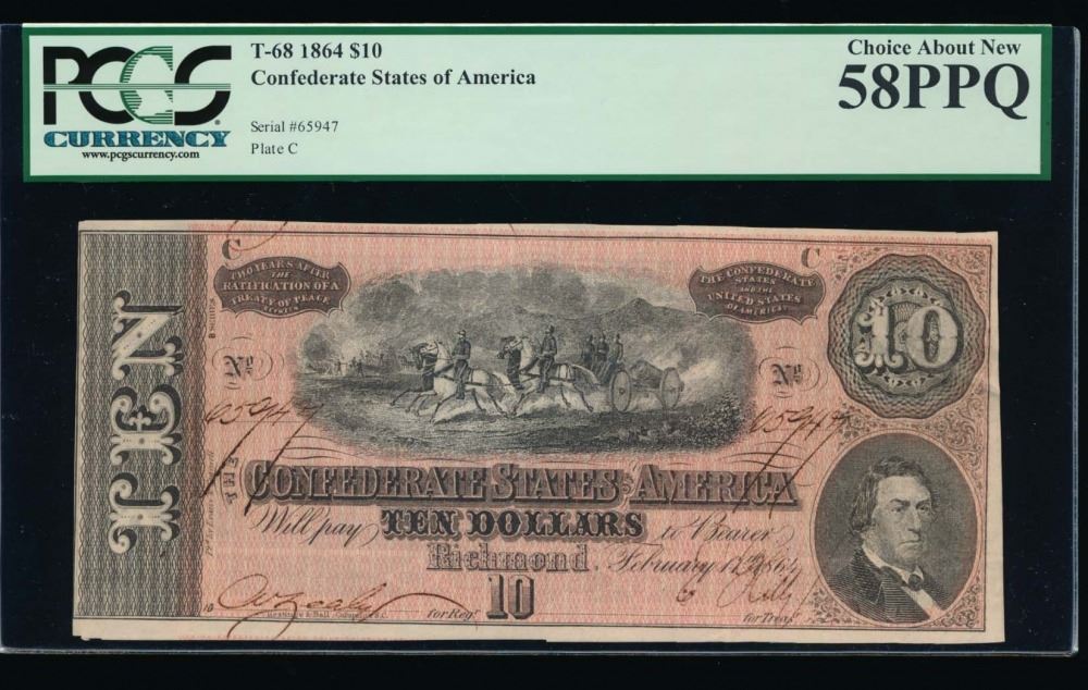 One 1864 $10 Confederate States of America Note PCGS 58PPQ.