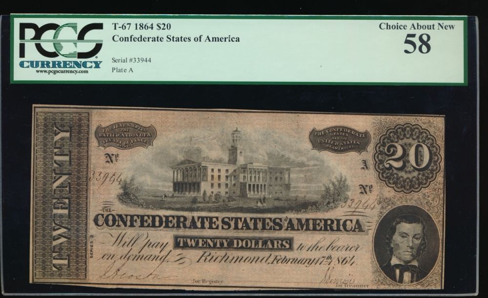 One 1864 $10 Confederate States of America Note PCGS 58.