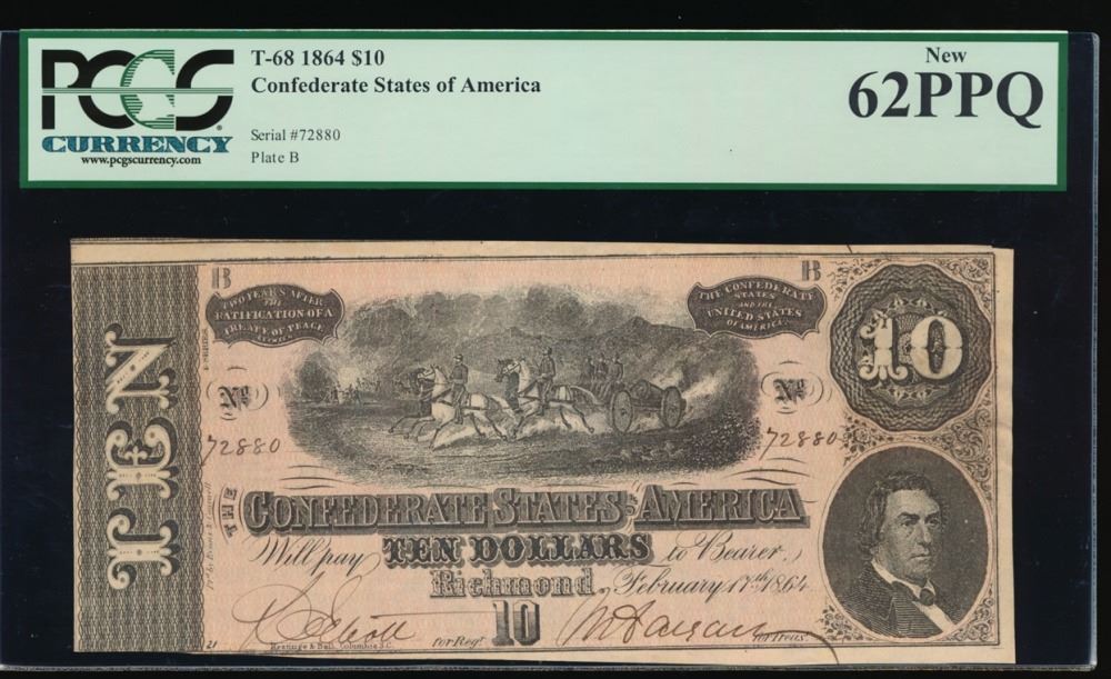 One 1864 $10 Confederate States of America Note PCGS 62PPQ.