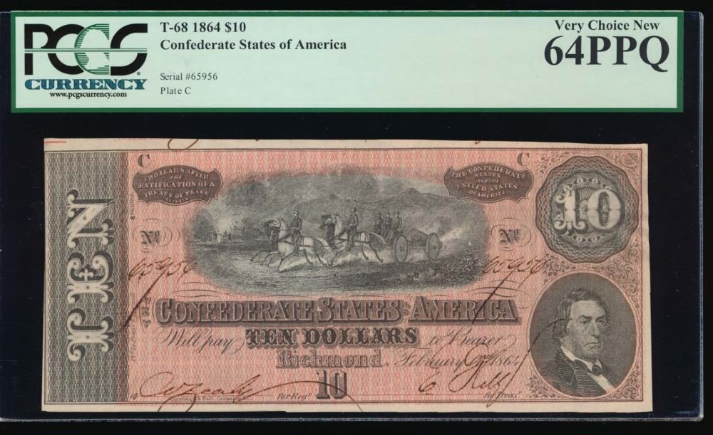 One 1864 $10 Confederate States of America Note PCGS 64PPQ.