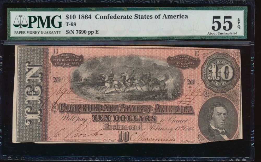 One 1864 $10 Confederate States of America Note PMG 55EPQ.