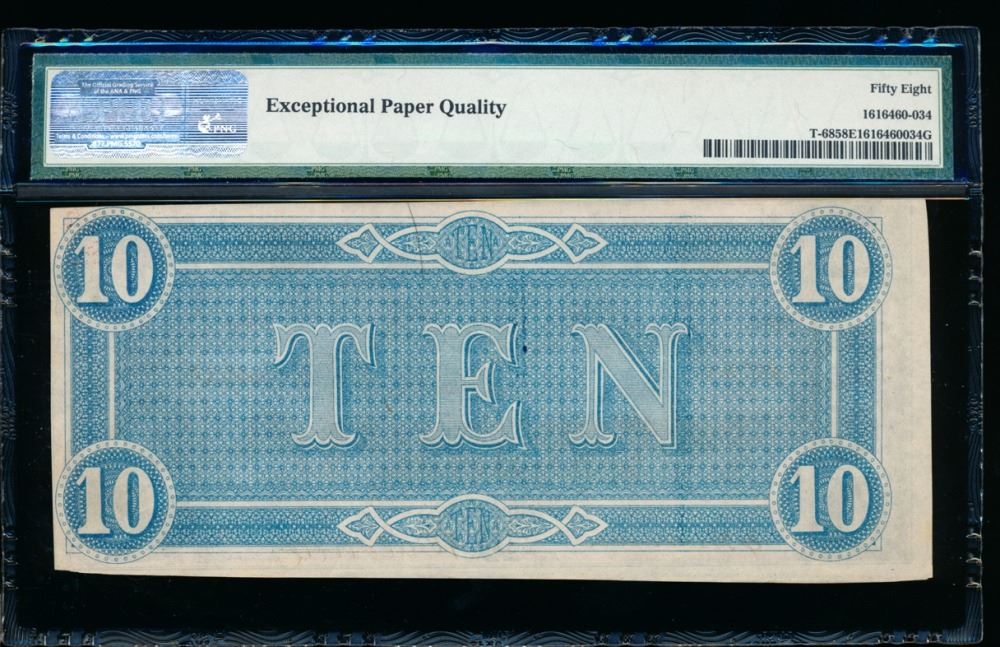 One 1864 $10 Confederate States of America Note PMG 58EPQ.