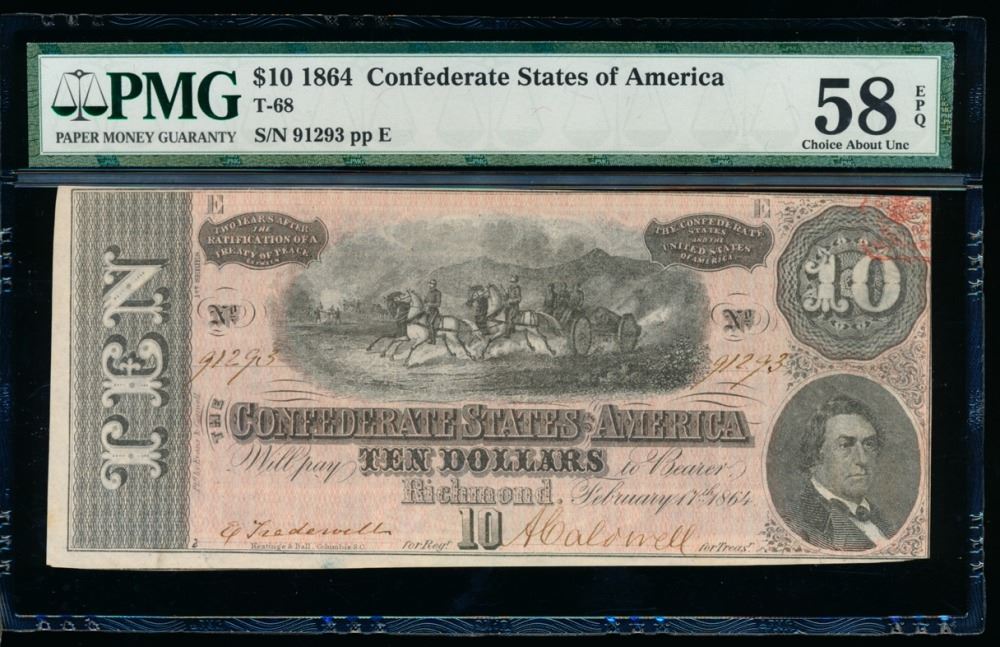 One 1864 $10 Confederate States of America Note PMG 58EPQ.