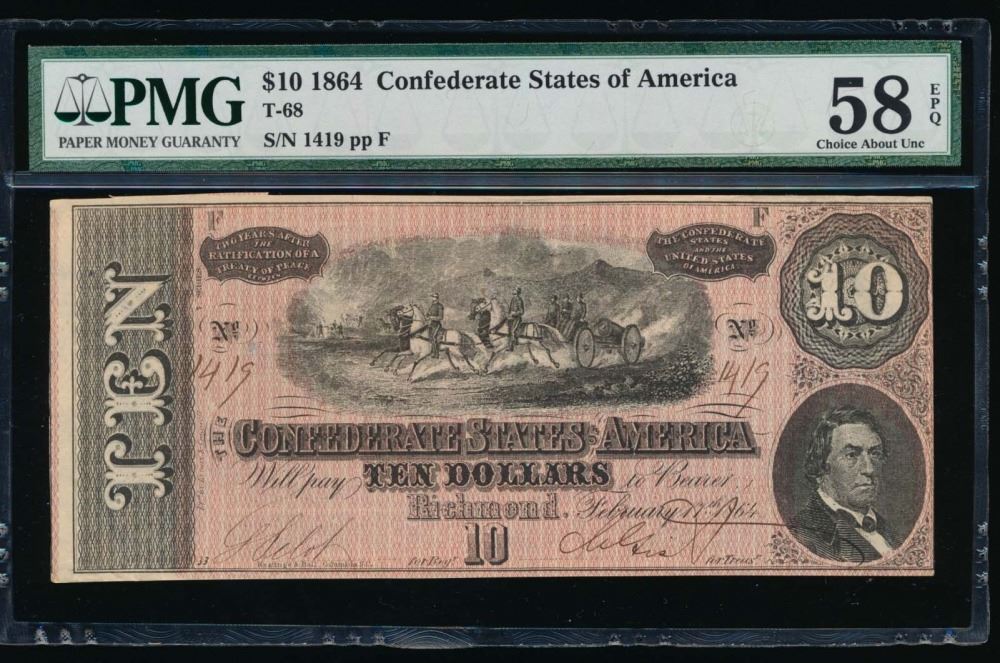 One 1864 $10 Confederate States of America Note PMG 58EPQ.