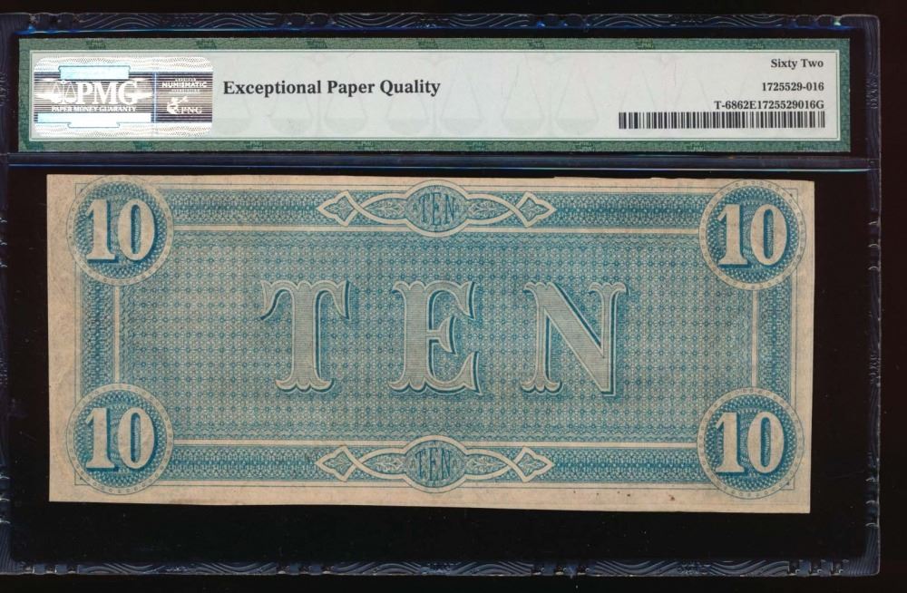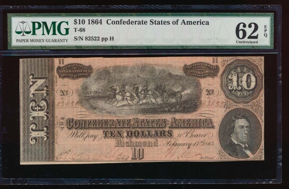 One 1864 $10 Confederate States of America Note PMG 62EPQ.