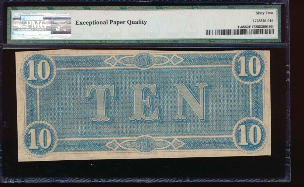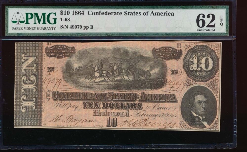 One 1864 $10 Confederate States of America Note PMG 62EPQ.