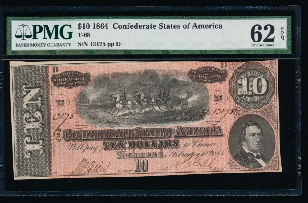 One 1864 $10 Confederate States of America Note PMG 62EPQ.