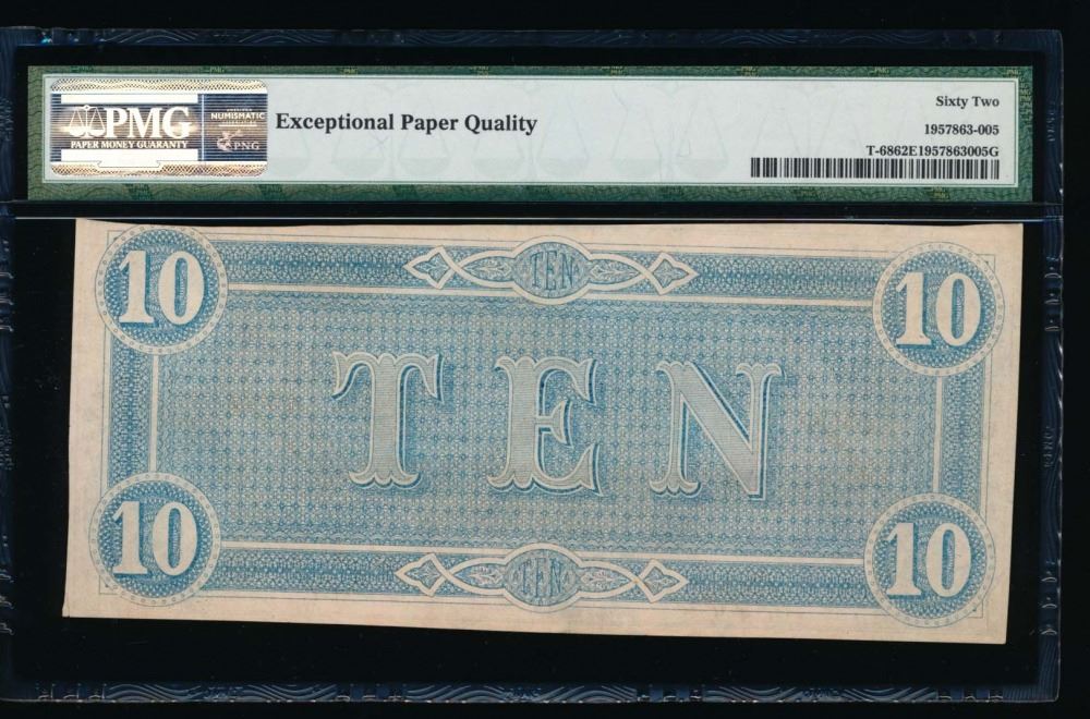 One 1864 $10 Confederate States of America Note PMG 62EPQ.