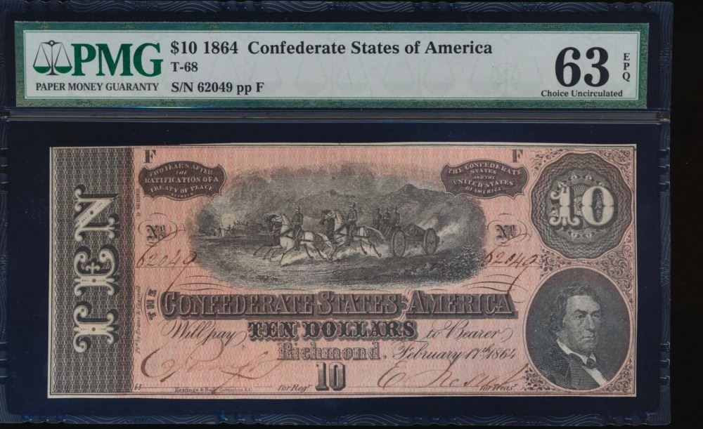 One 1864 $10 Confederate States of America Note PMG 63EPQ.